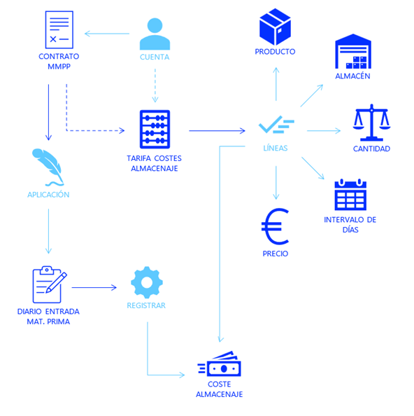 Los días de plancha se configuran directamente en los contratos. Una vez registrada una operación, el sistema identifica automáticamente la tarifa de costes de almacenaje que debe aplicarse, teniendo en cuenta el intervalo de días que corresponde, la cantidad de materia prima y el lugar donde se encuentra almacenada. Este proceso se detallará más adelante en el documento.