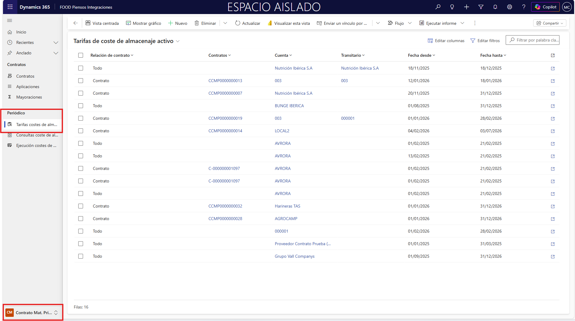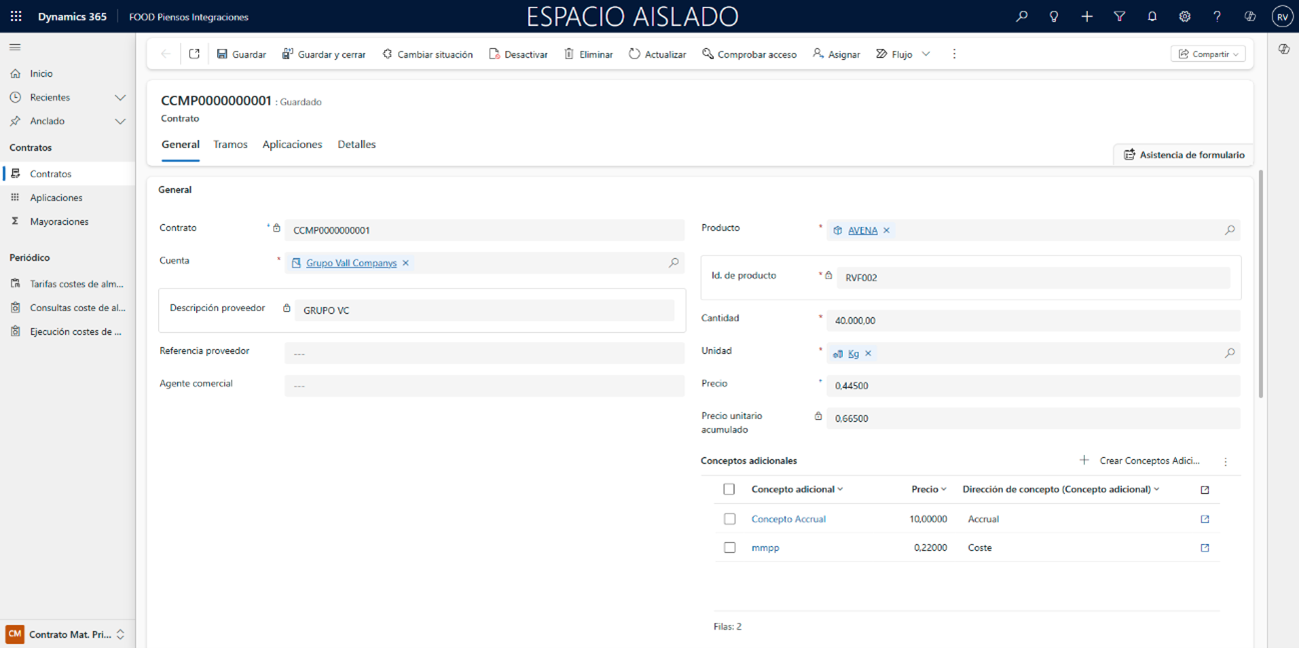 Contratos: Se escogerá entre los distintos “Contratos” existentes. Servirá para filtrar los contratos donde aplicar la tarifa, cuando Relación de contrato = “Contrato”. Ejemplo:CON-2026-014 – Compra de Soja Grado 47% – Proveedor AgroAlfa