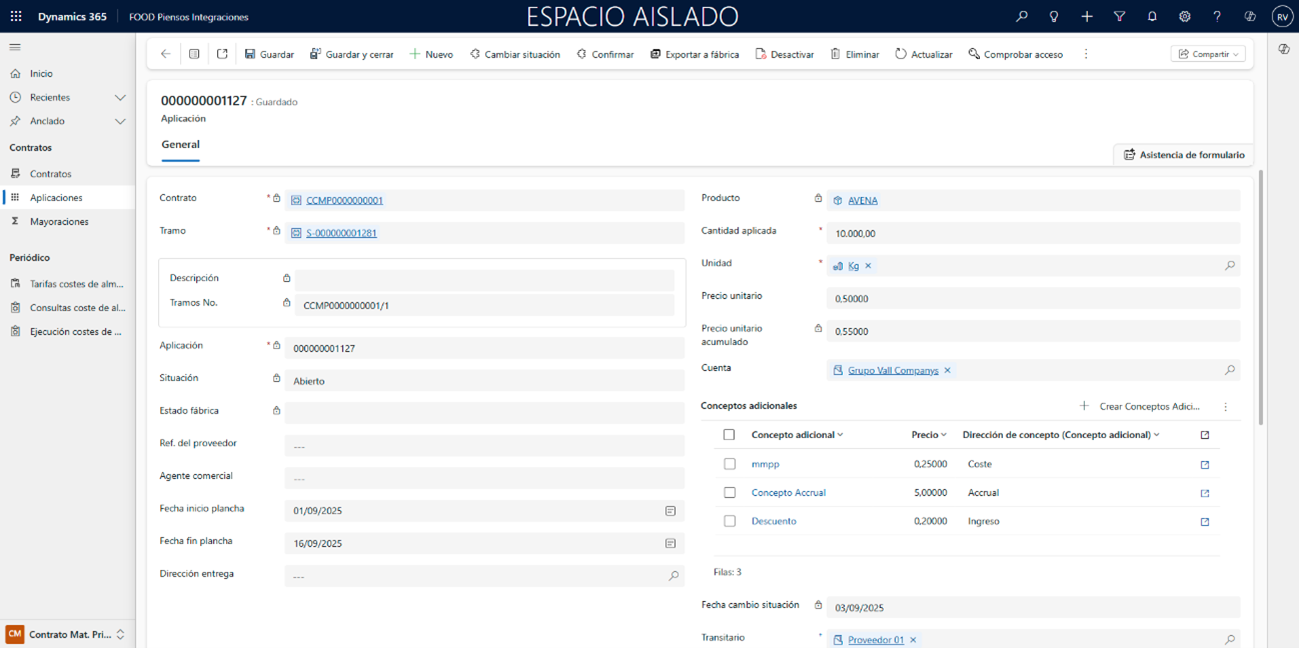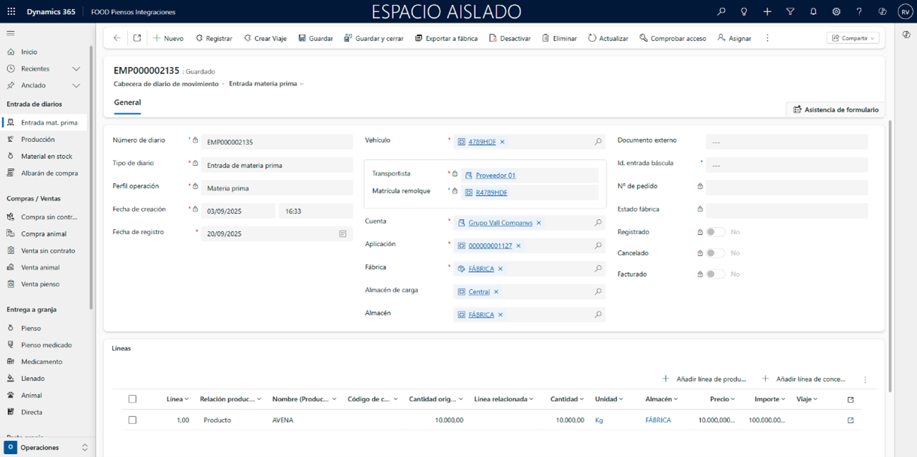 Para las entradas de materias primas, dado que es obligatorio informar el campo Vehículo, asegúrese de que tanto las fechas del Contrato de Transporte, asignado al transportista del vehículo, como las fechas de la tarifa usada en dicho contrato estén actualizadas y cubran el período de la operación prevista. De lo contrario, podrían producirse errores al registrar.