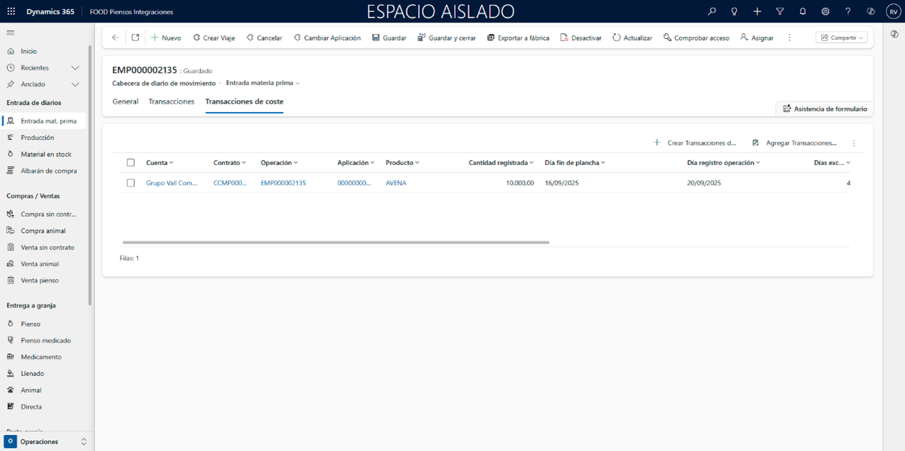 Cuando se confirme la recepción de materias, registre el diario (modificando la Fecha de registro al día correspondiente). El sistema calculará automáticamente los costes de almacenaje, que se visualizarán en la última pestaña del diario, Transacciones de coste.