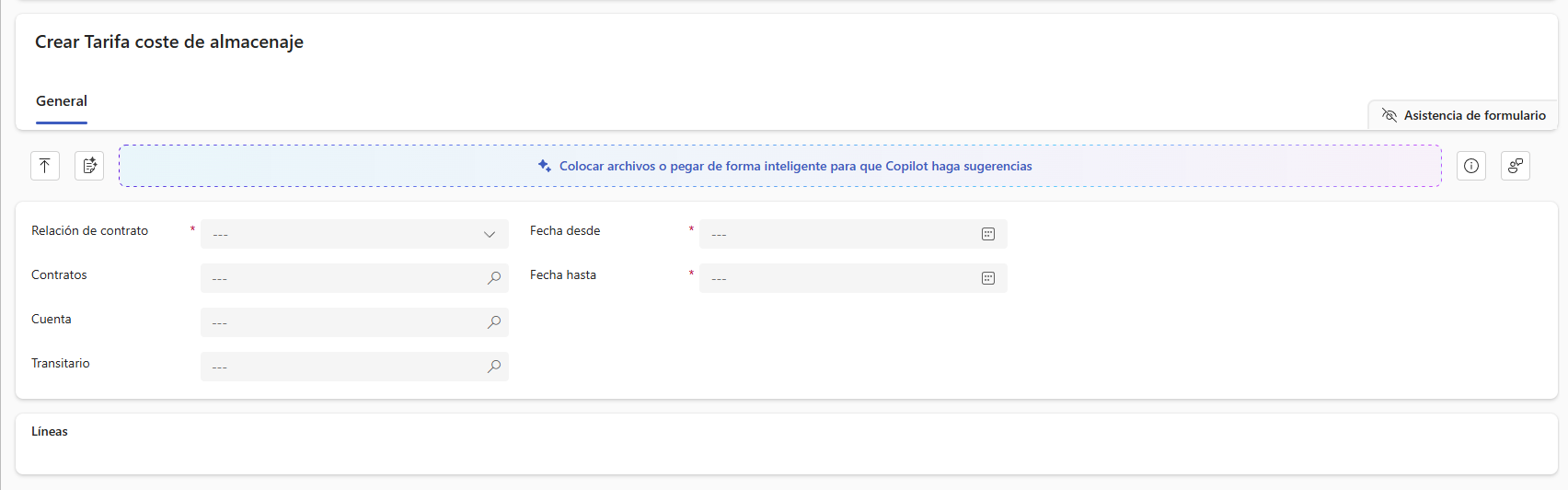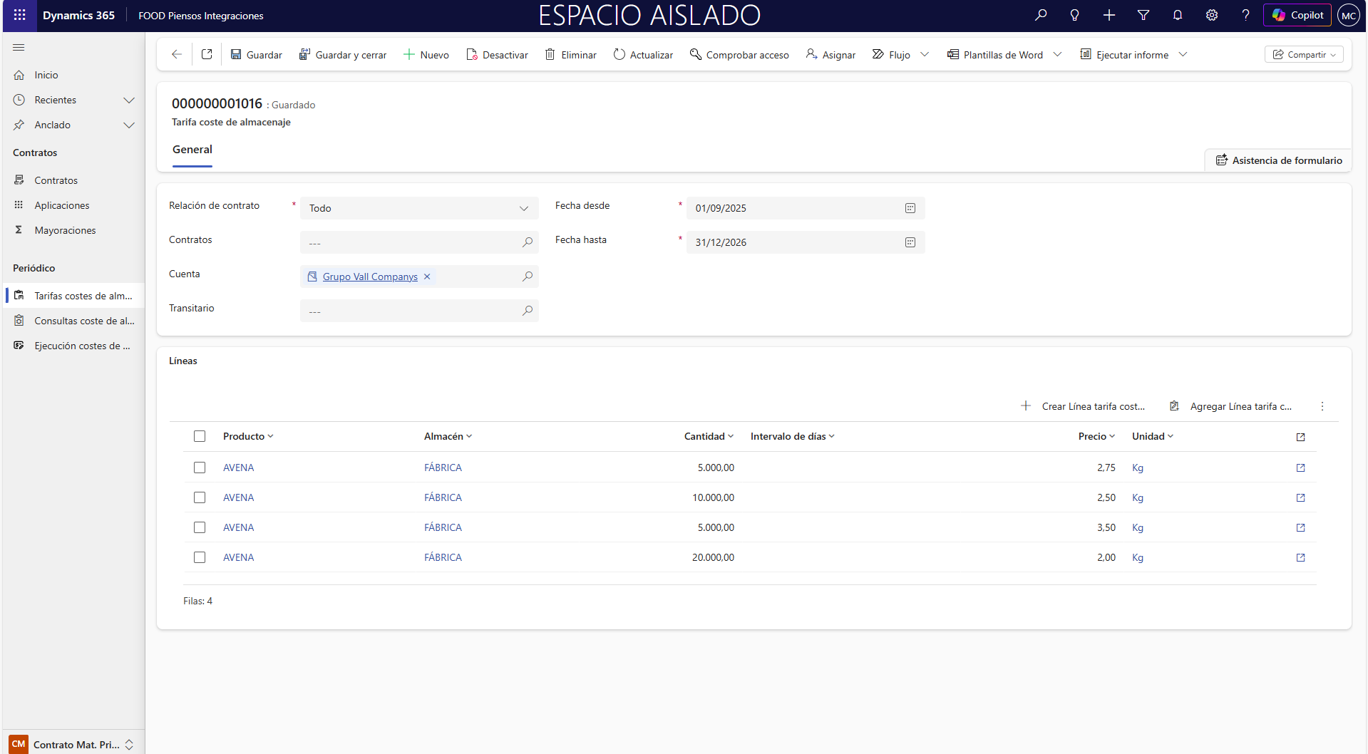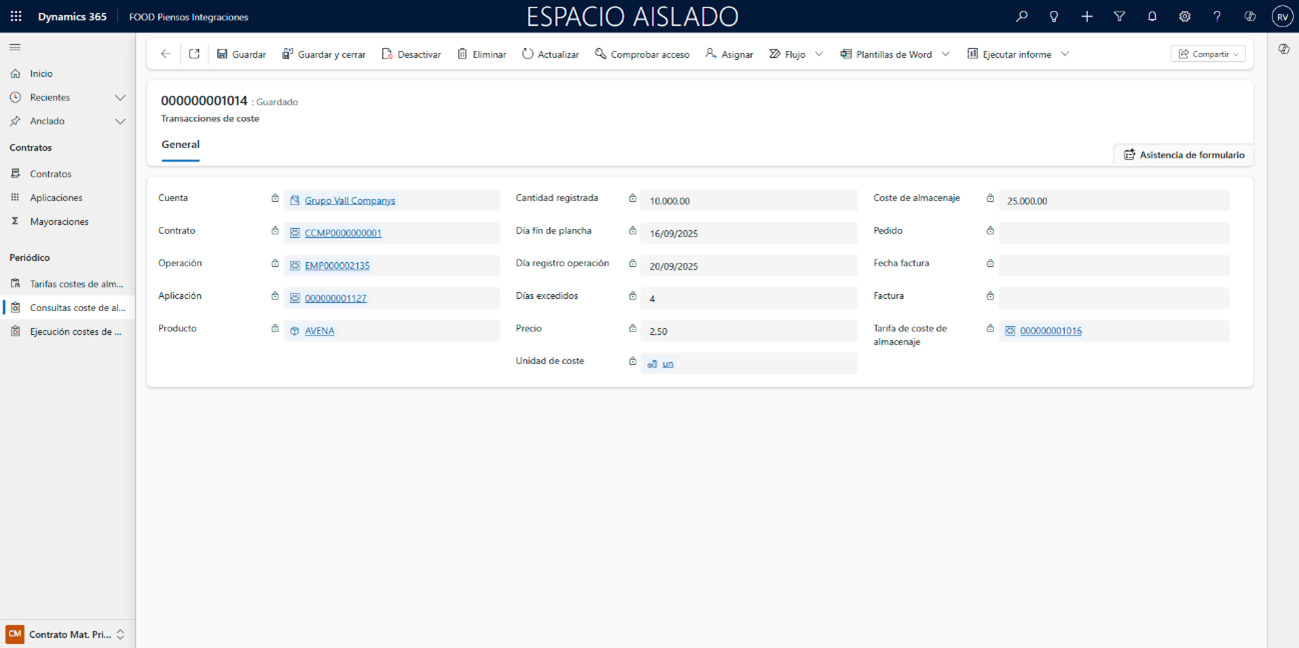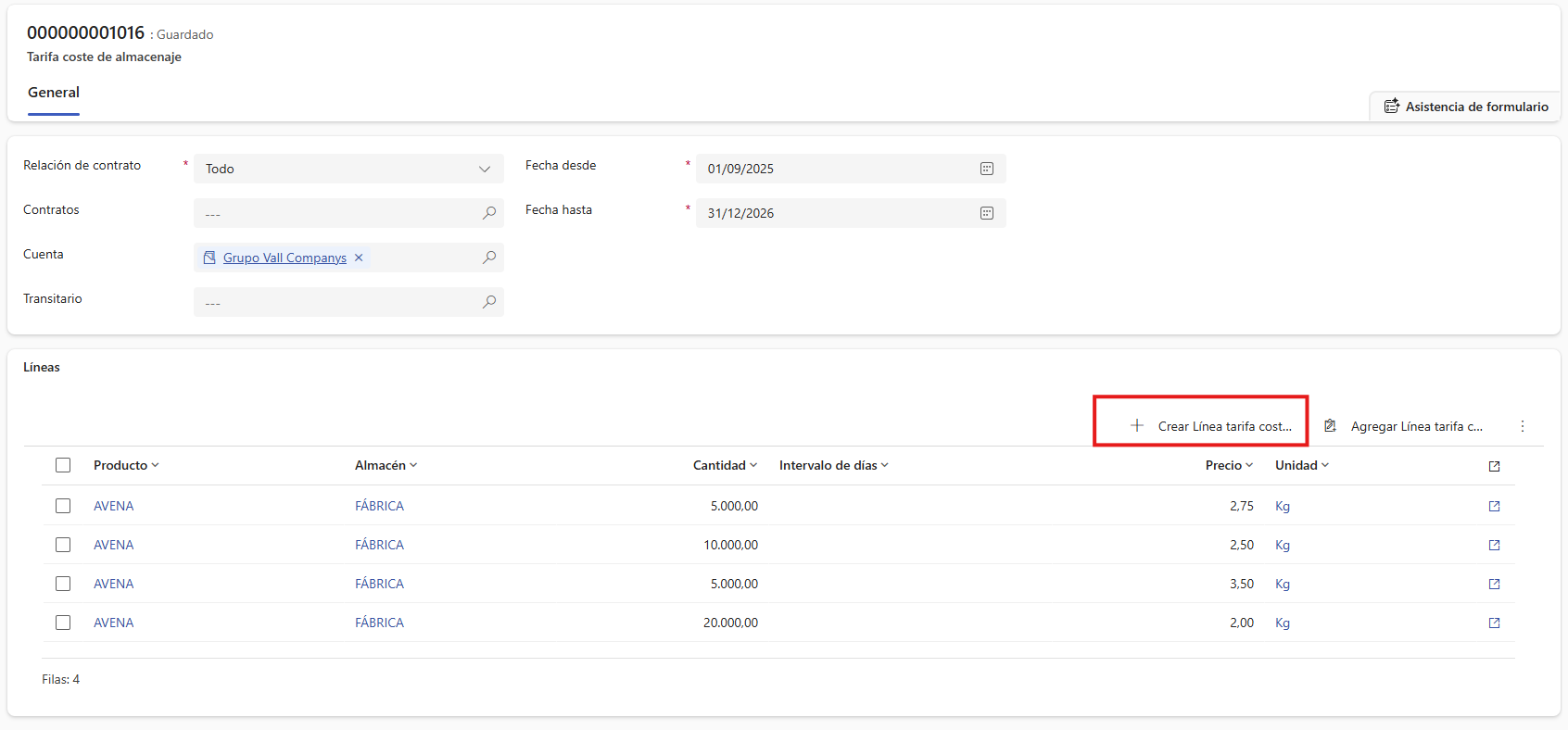 Precio: Se hereda automáticamente de la línea aplicada de la Tarifa de coste de almacenaje.