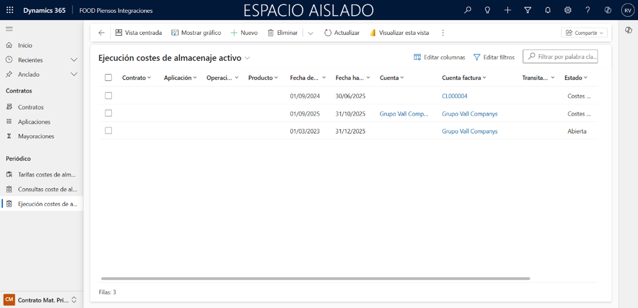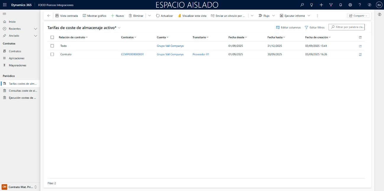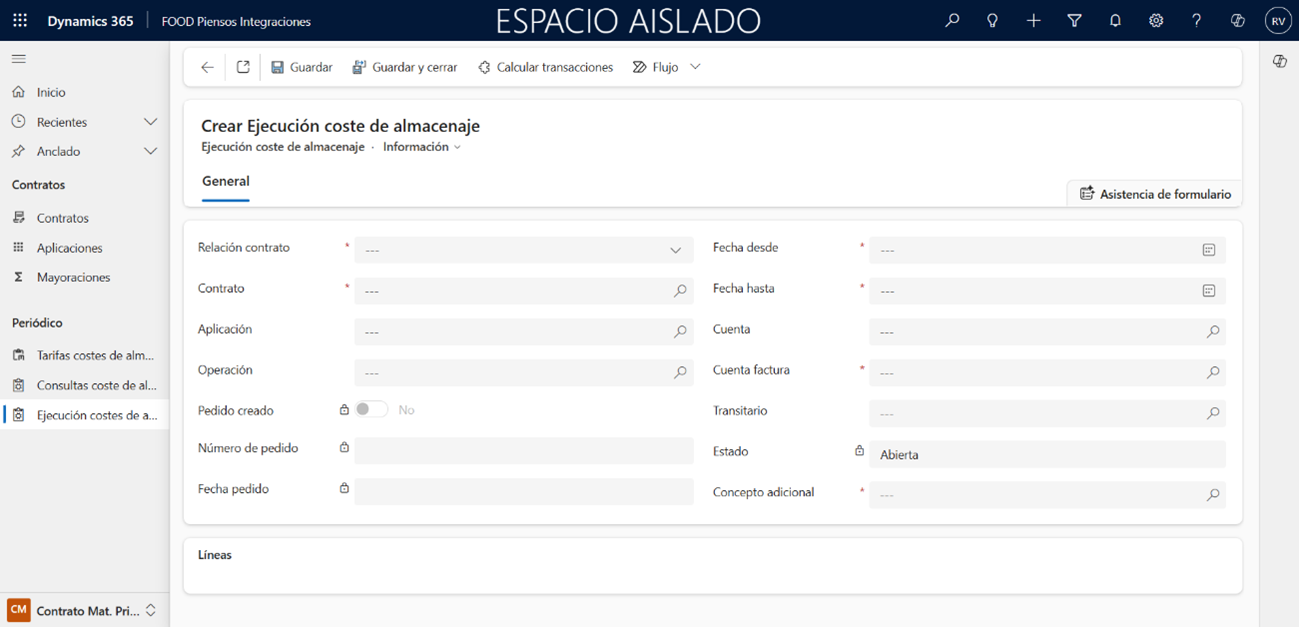 Es posible crear pedidos asociados a los costes de almacenaje accediendo al punto de menú Contrato Mat. Prima > Periódico > Ejecución costes de almacenaje. Esta funcionalidad se importa desde FOOD Materia Prima y requiere la colaboración con el equipo de desarrollo de IFR para asegurar que el proceso funcione correctamente según sus necesidades y requisitos.