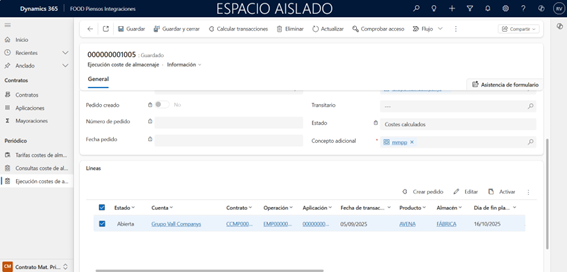 El sistema buscará los costes de almacenaje que cumplan los requisitos establecidos en la cabecera, al pulsar el botón Calcular transacciones.