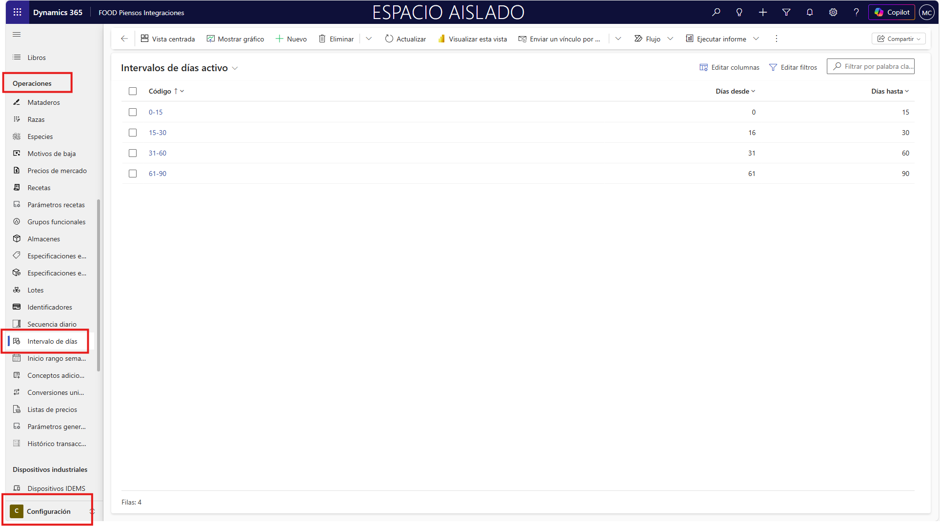 Para crear estos intervalos, desde el Menú principal seleccione Configuración. El punto de menú que busca es el de Intervalo de días dentro la sección Operaciones.