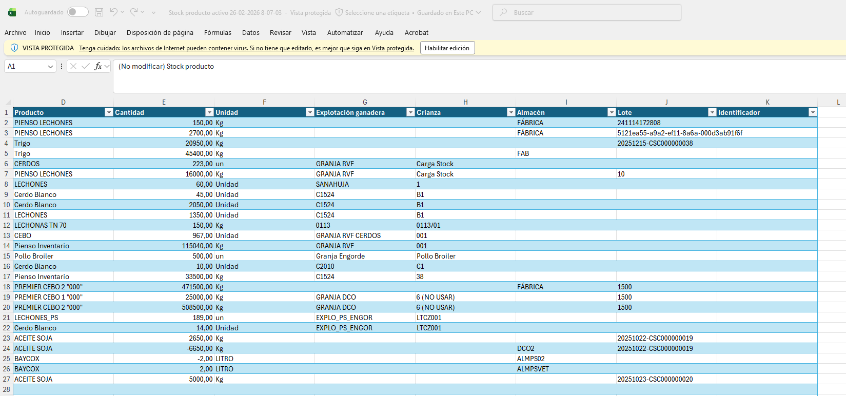 Asegúrese de que todos los valores de las columnas que necesitan una referencia dentro de la aplicación existan. Por ejemplo, a la hora de importar el siguiente archivo relativo al stock: