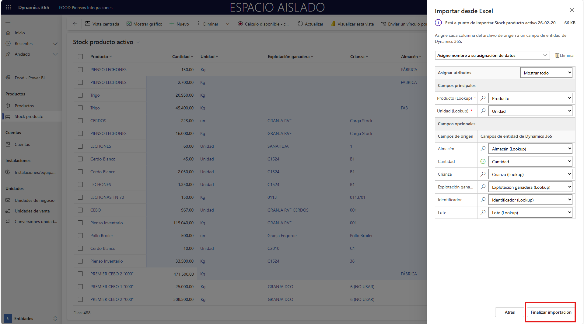 Confirme que los campos de origen del Excel corresponden con los de destino de FOOD y pulse Finalizar importación.