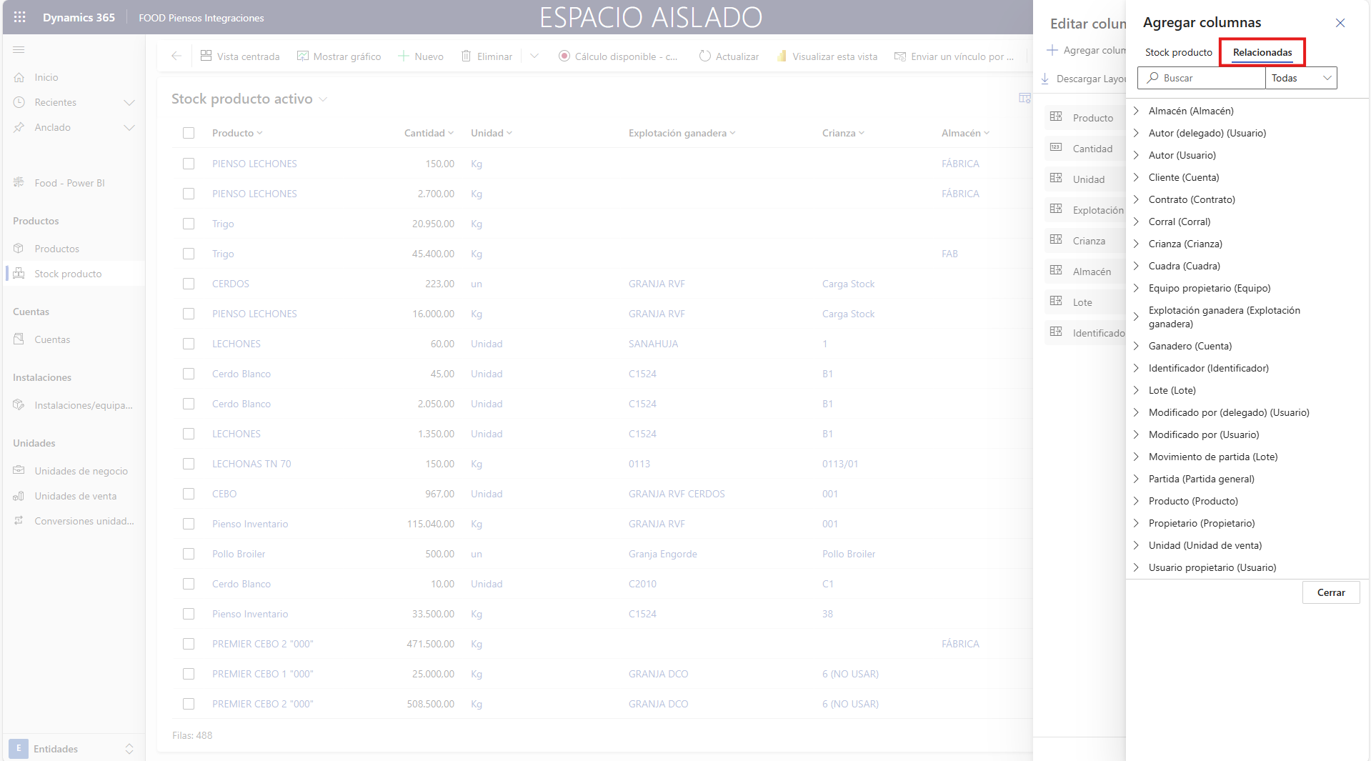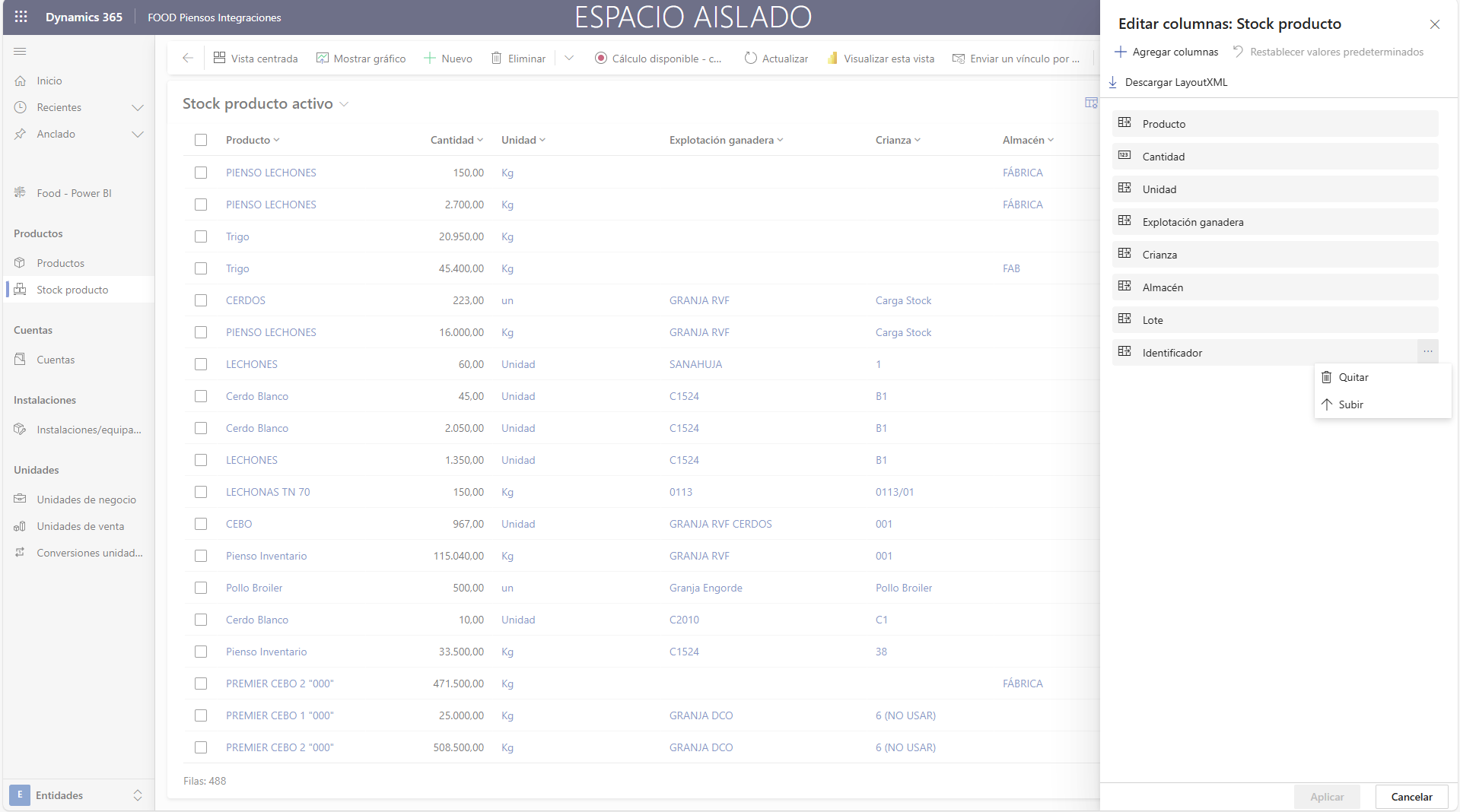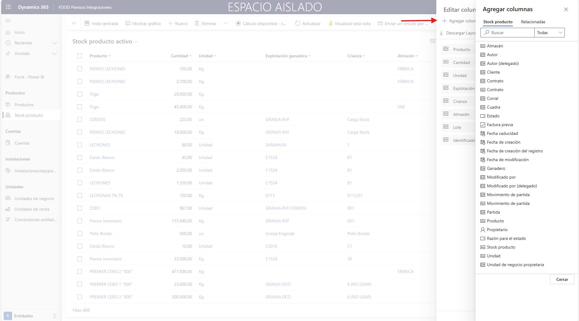 Para añadir columnas de datos nuevas, pulse Editar columnas para modificar los campos que desea visualizar y su orden. Esta opción está disponible en todas las tablas de los puntos de menú de FOOD.