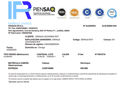 La aplicación incorpora la funcionalidad de imprimir documentos al ejecutar ciertos procesos, permitiendo complementar la información registrada mediante la generación automática de documentación asociada. Actualmente existen tres plantillas disponibles: el albarán de compras de piensos, las etiquetas para piensos medicados y medicamentos, y las liquidaciones de venta animal. Dado que las necesidades documentales pueden variar significativamente en campos, estilo y composición, IFR ofrece la posibilidad de modelar cada documento a medida, adaptándose a las especificaciones del cliente.