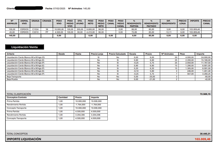 También es posible generar documentos más técnicos, como la liquidación por matanza de animales. En este caso, a partir de un diario e información adicional, puede generarse plantillas con valores como los siguientes: