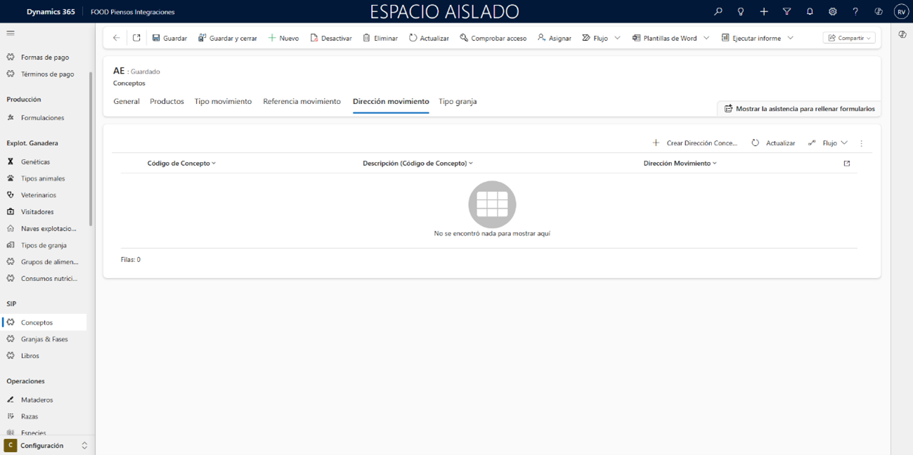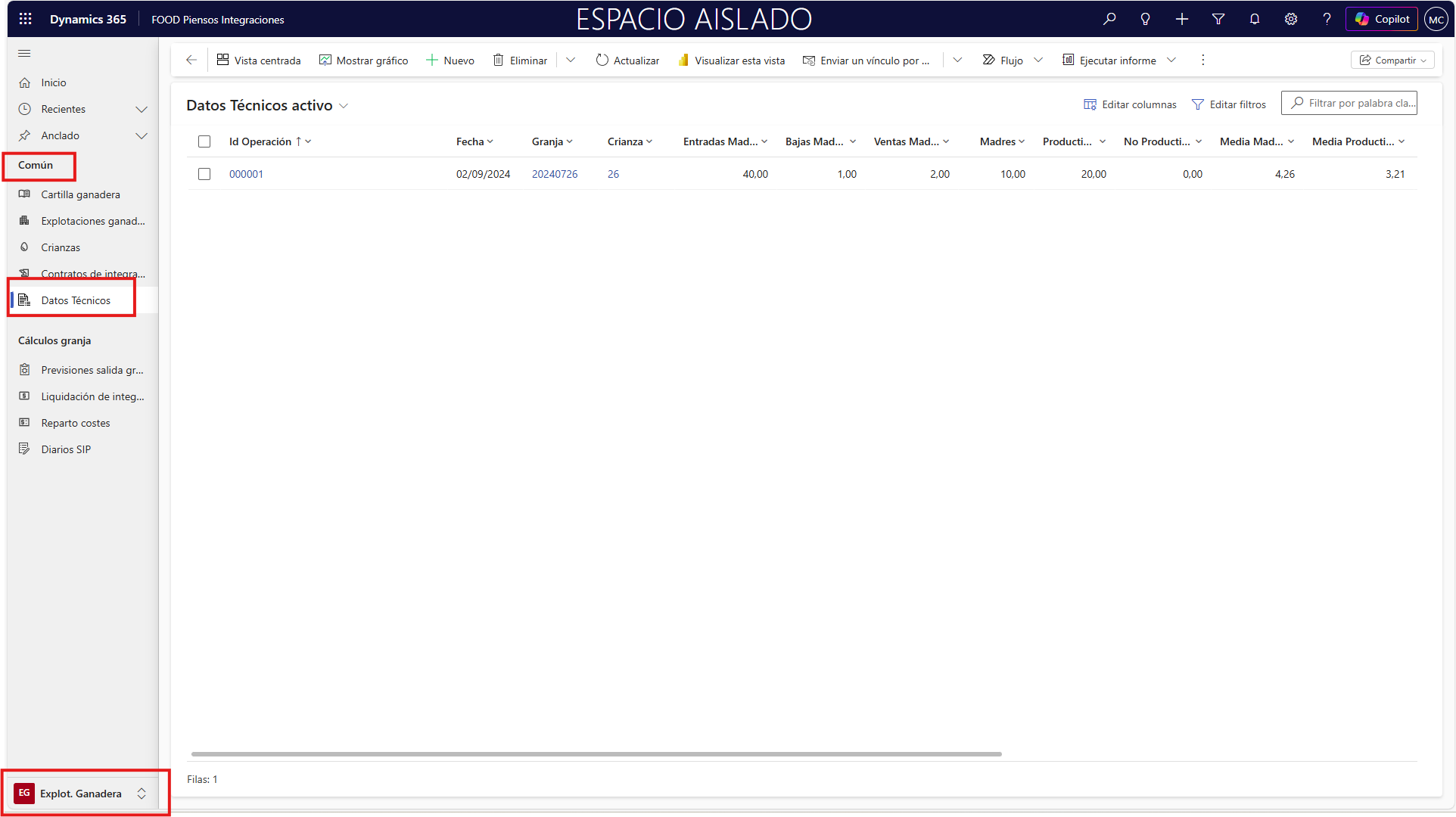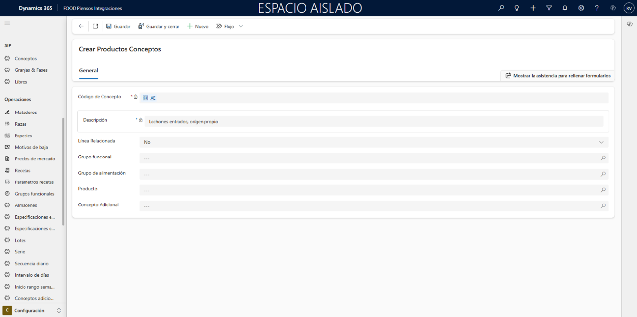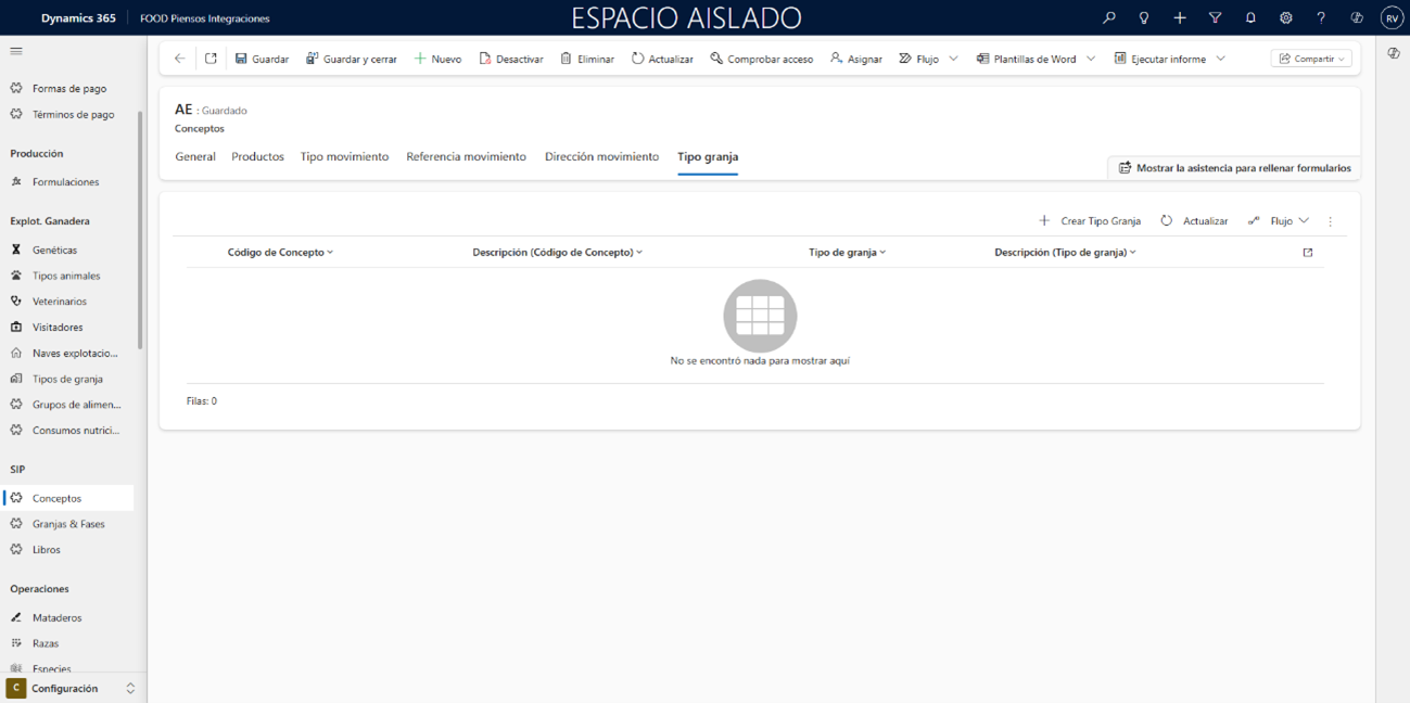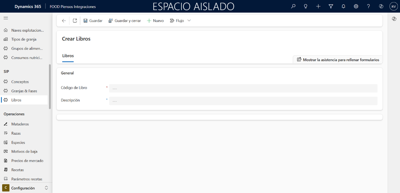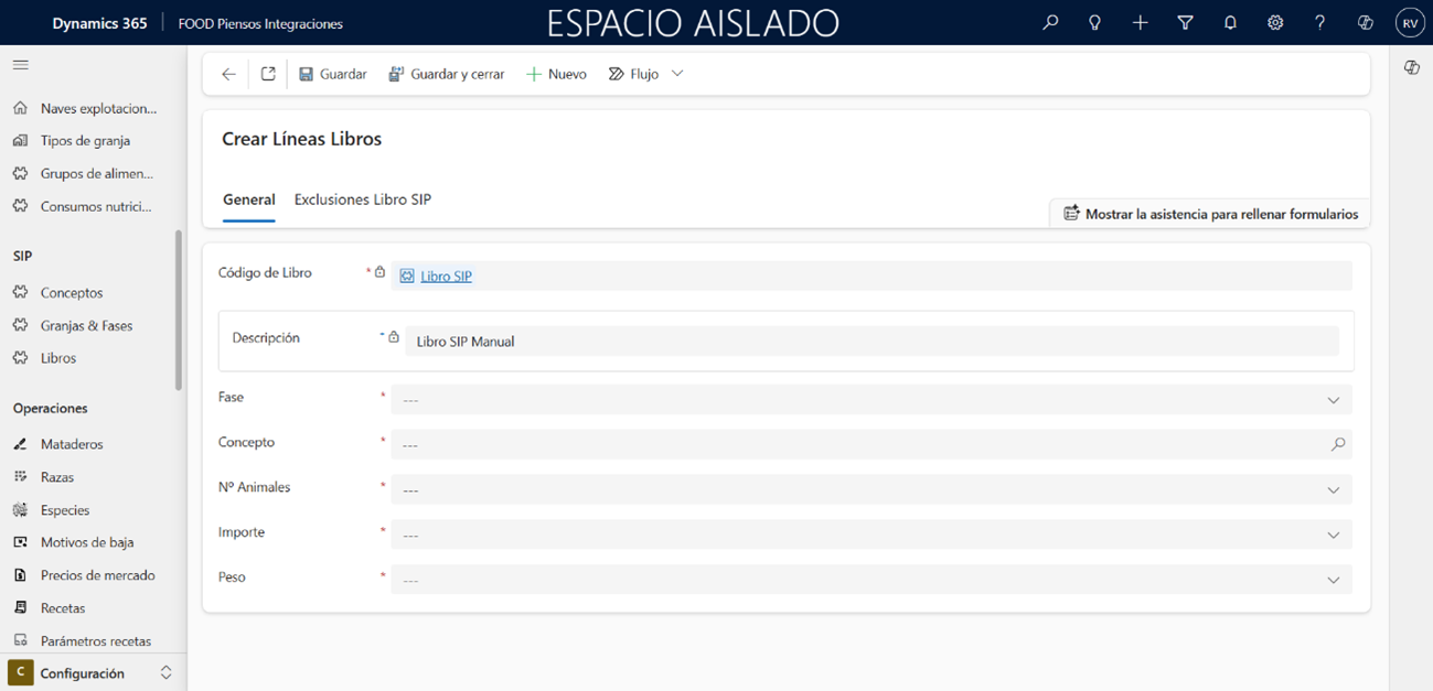 Aparecerán indicados tanto el libro como la línea. Indique el campo Granja, seleccionando una de las “Explotaciones ganaderas” del entorno.