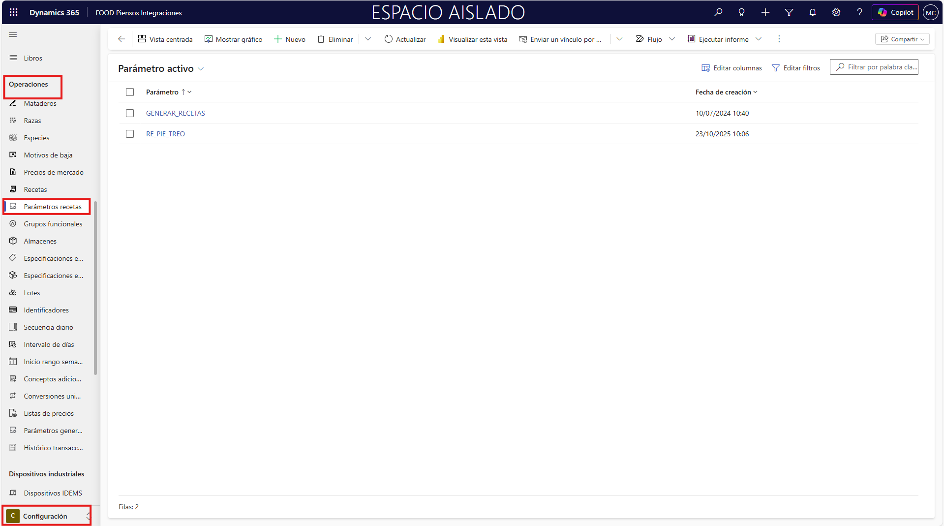 2. Parámetros Recetas