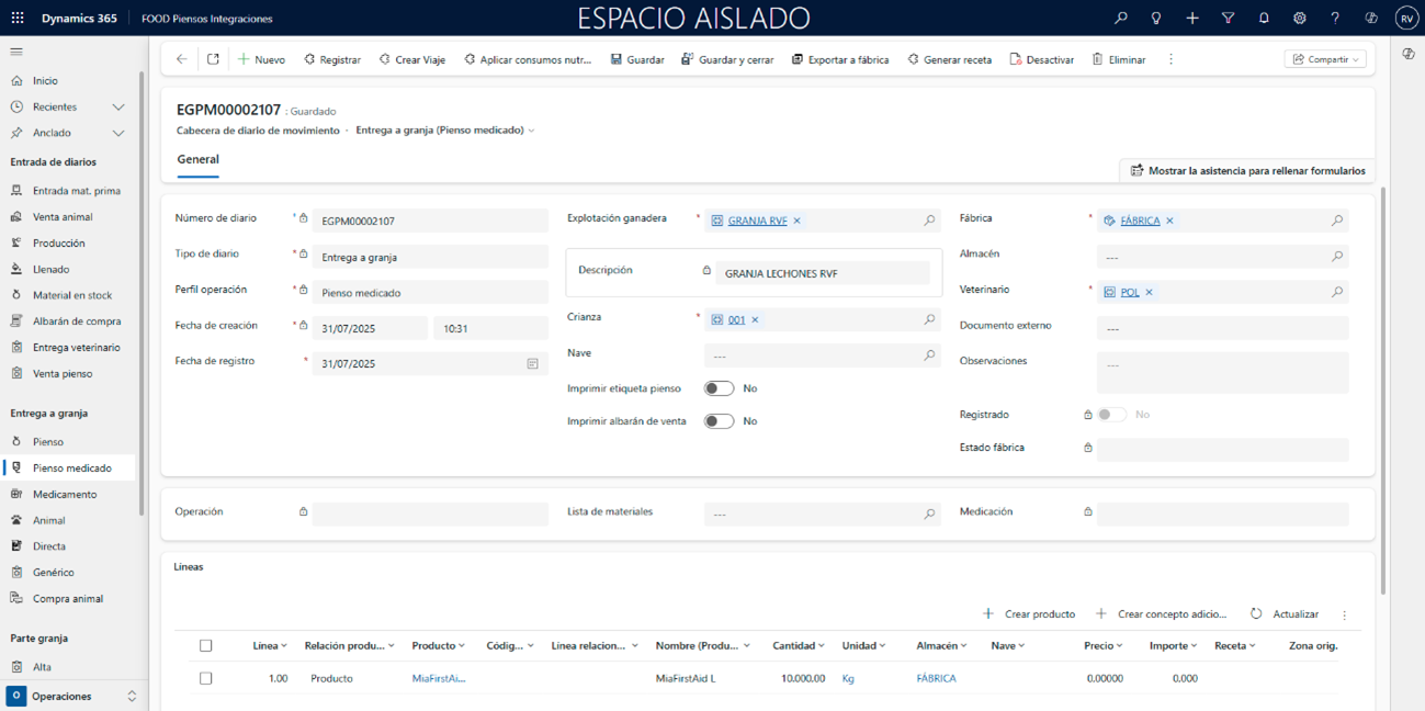 - Dosis: Resultante de la cantidad de medicamento (KG) / cantidad de pienso (TN). En caso de que una de estas dos cantidades se encuentre en otras unidades, el sistema realizará la conversión a las correspondientes usando la configuración de Entidades > Unidades > Conversiones unidades venta.