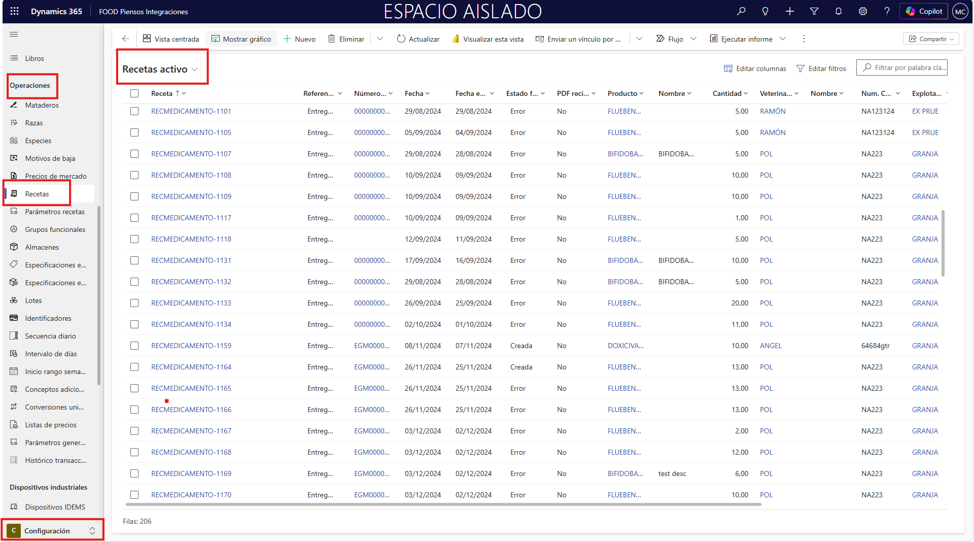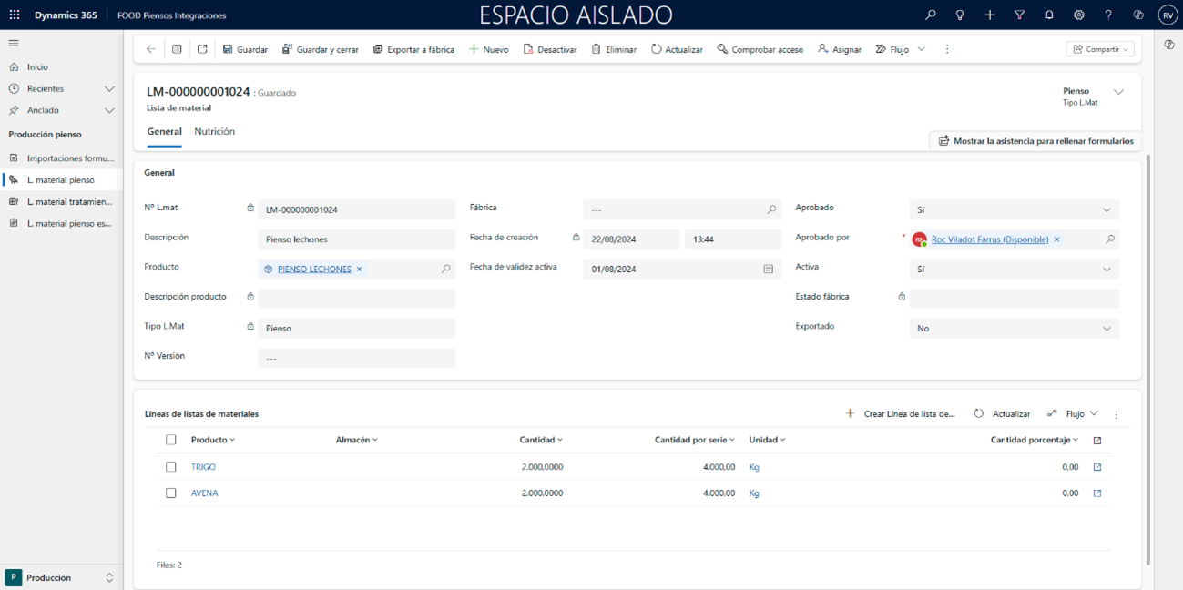Falta de listas o configuración incompleta El producto no tiene ninguna lista de materiales vinculada. El sistema mostrará un error y no generará la receta. En este caso, regrese a los módulos anteriores y complete los requisitos previos (Recetas FOOD Piensos Integraciones).