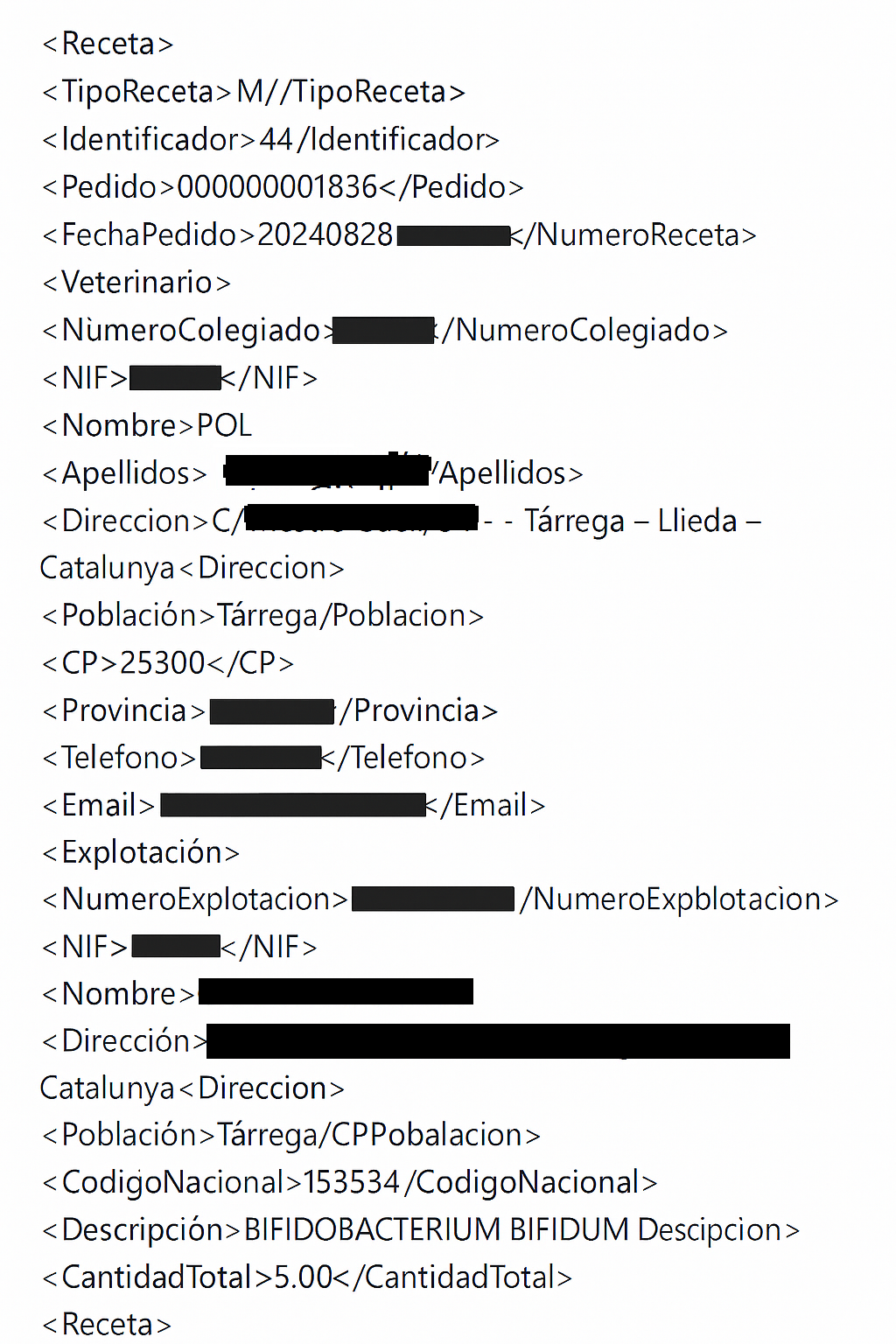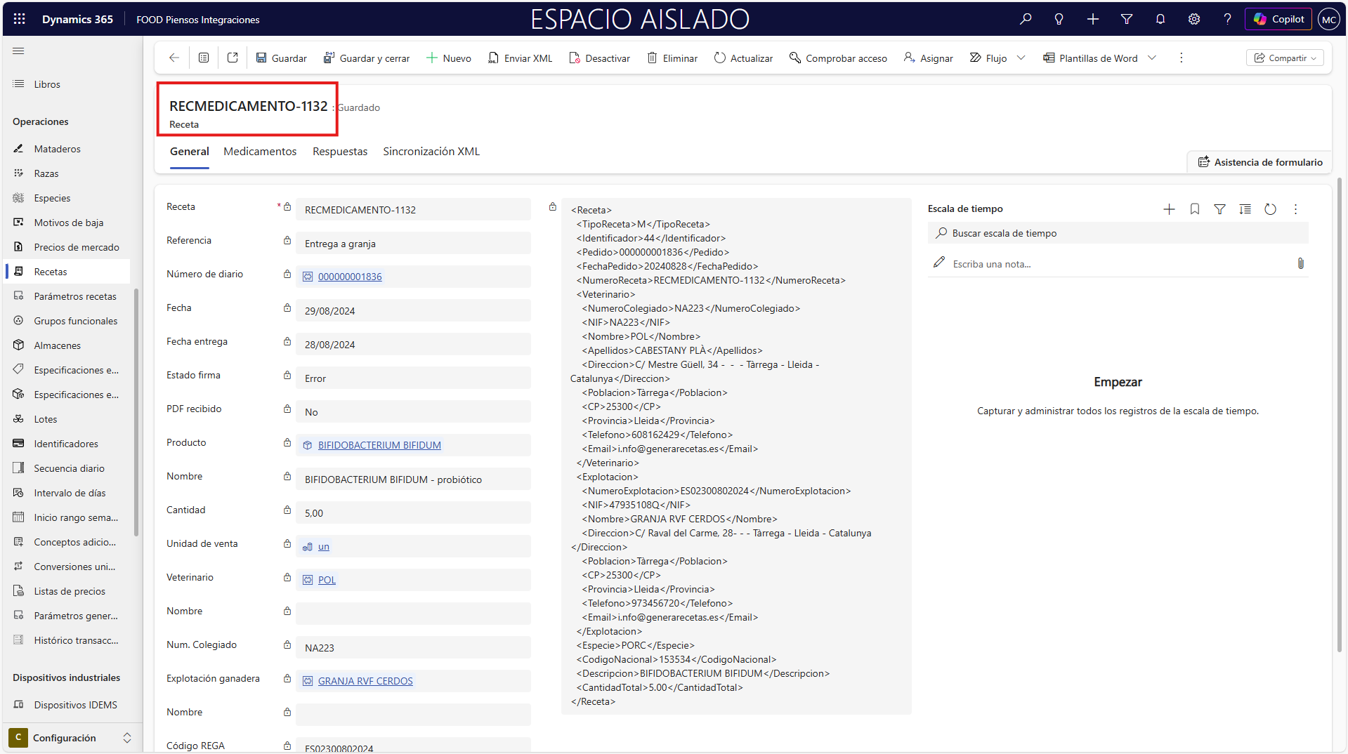Finalmente, esta receta se podrá imprimir pulsando el botón Enviar XML de la cabecera. Dado que, dependiendo de sus programas y gestión de datos concretos, tendrá unas necesidades concretas. Este botón no es funcional hasta que se realiza correctamente las conexiones y se identifica el proceso que debe realizar.
