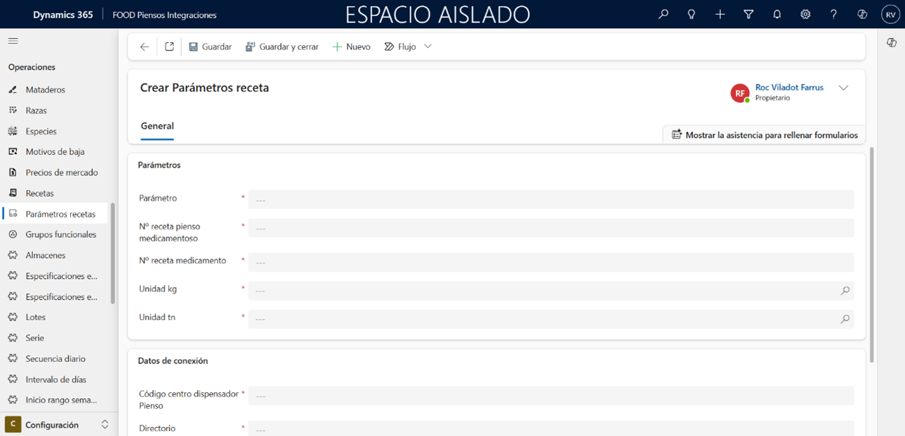 Para vincular la aplicación con el programa de generación de recetas, es necesario establecer la conexión desde el área de Configuración. Aunque la implementación será realizada por IFR, ciertos datos podrán ser editados posteriormente por el usuario. Para acceder a esta información, diríjase al Menú principal, seleccione el área de Configuración y, dentro del apartado Operaciones, haga clic en Parámetros de recetas.