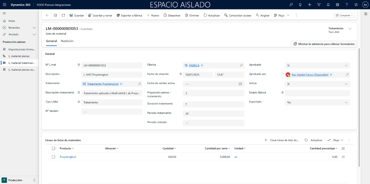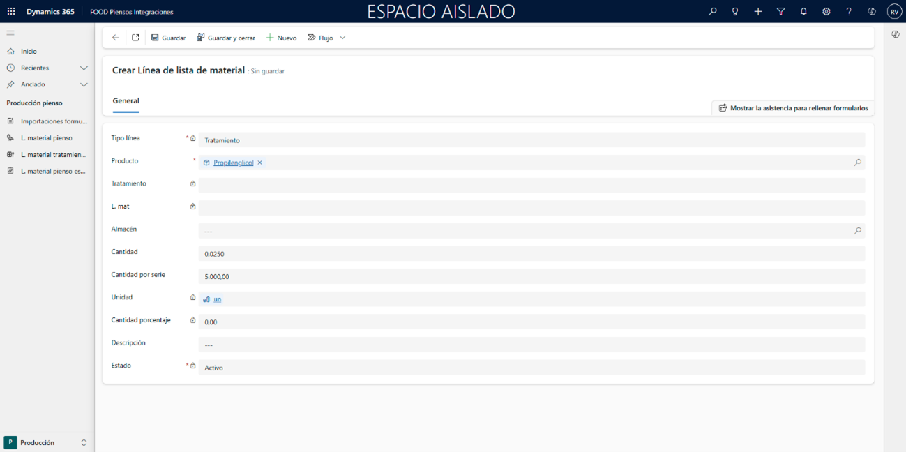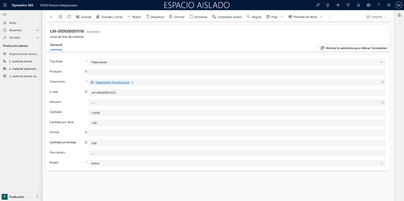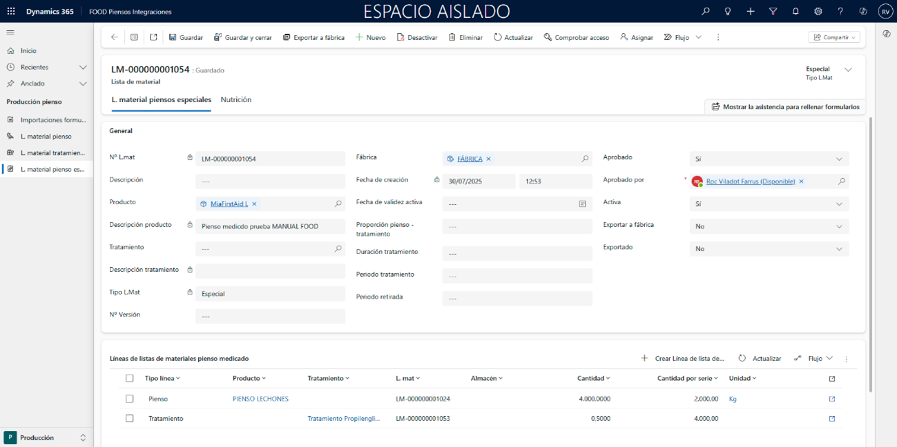 - La lista de pienso especial debe contener al menos una línea de tipo Tratamiento vinculada a una lista de materiales.