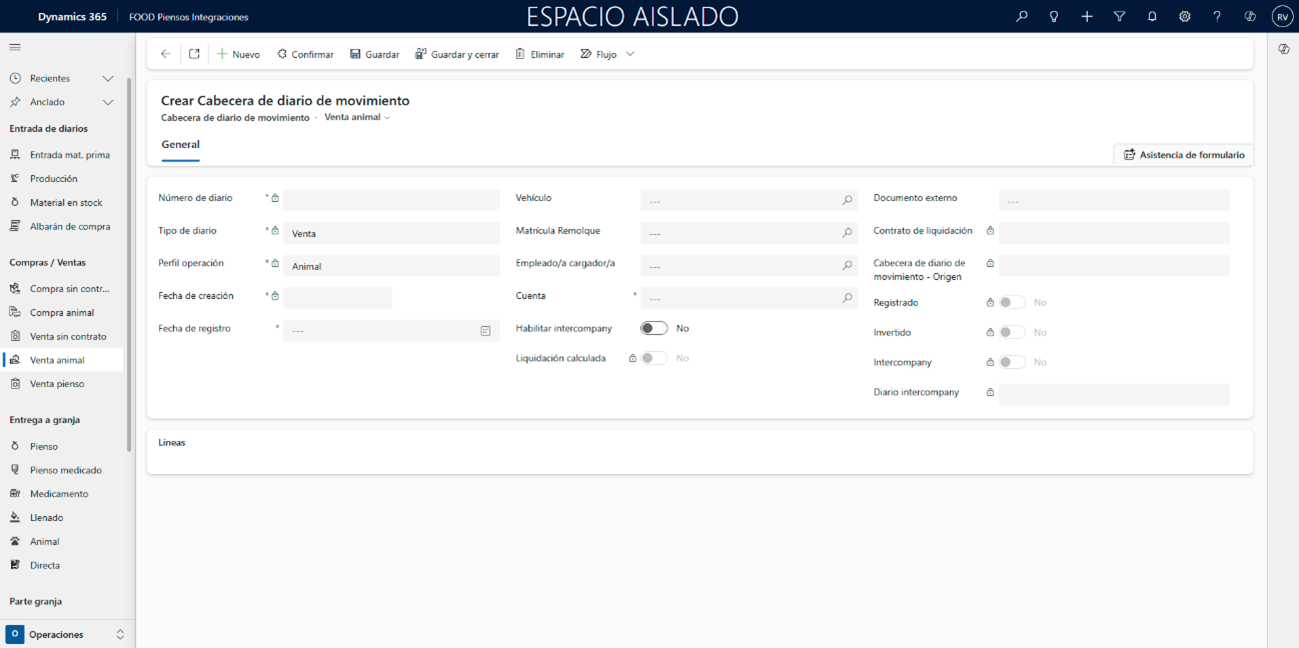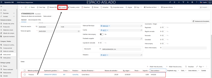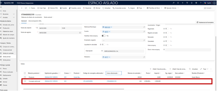 Nº diario: Se informará automáticamente con el Número de diario de Venta animal al confirmar la línea.