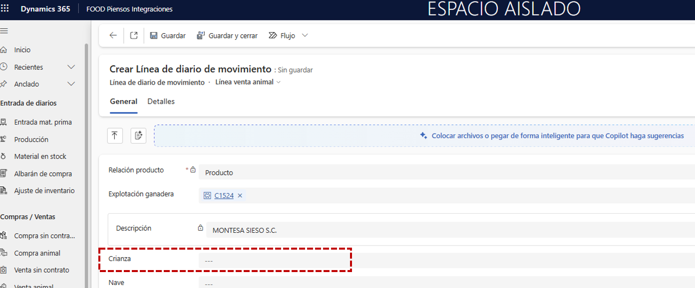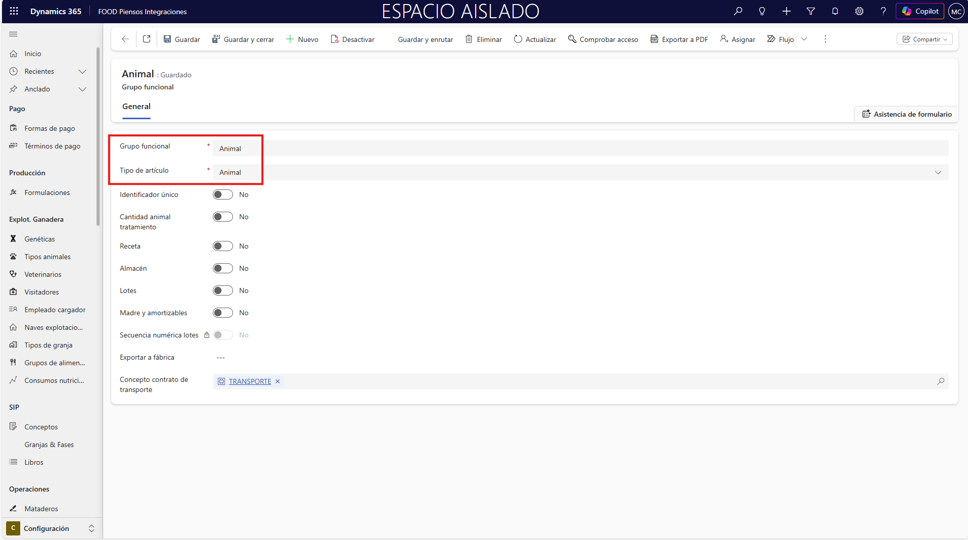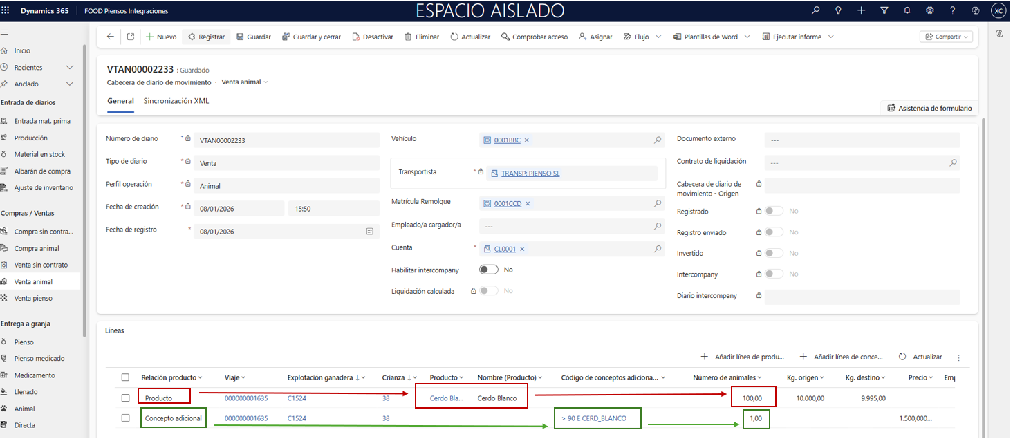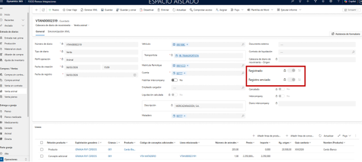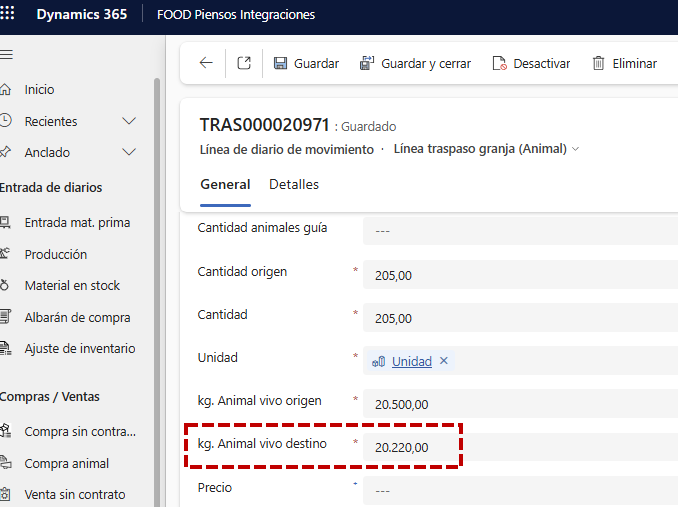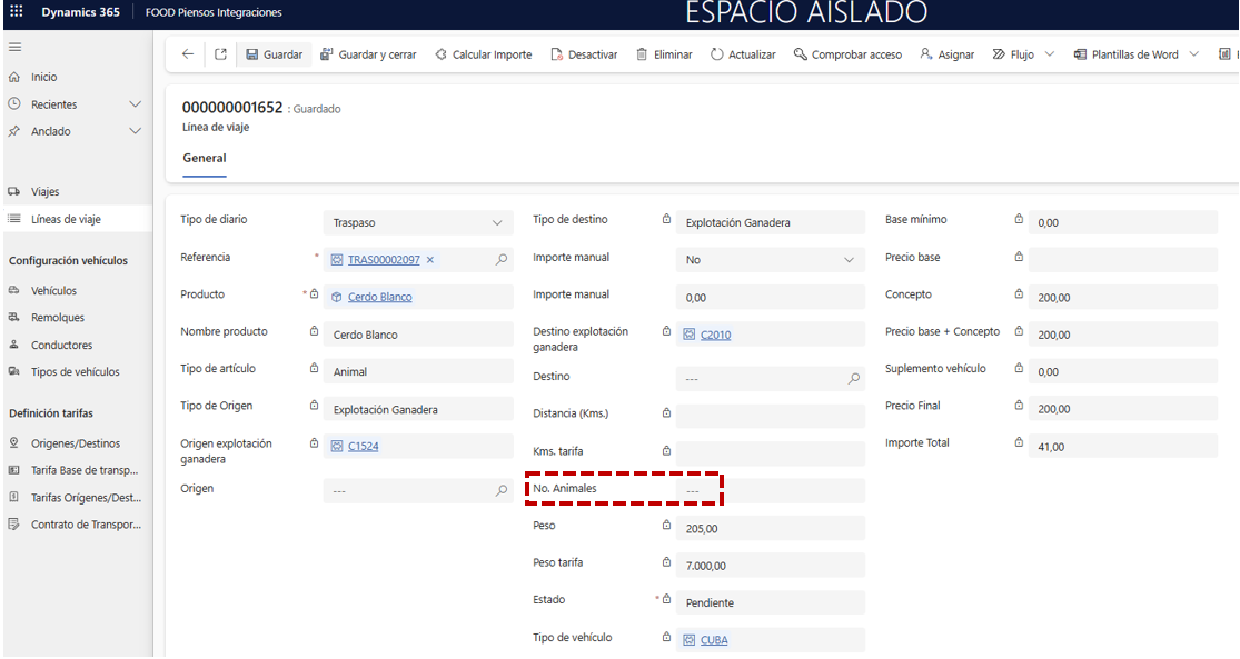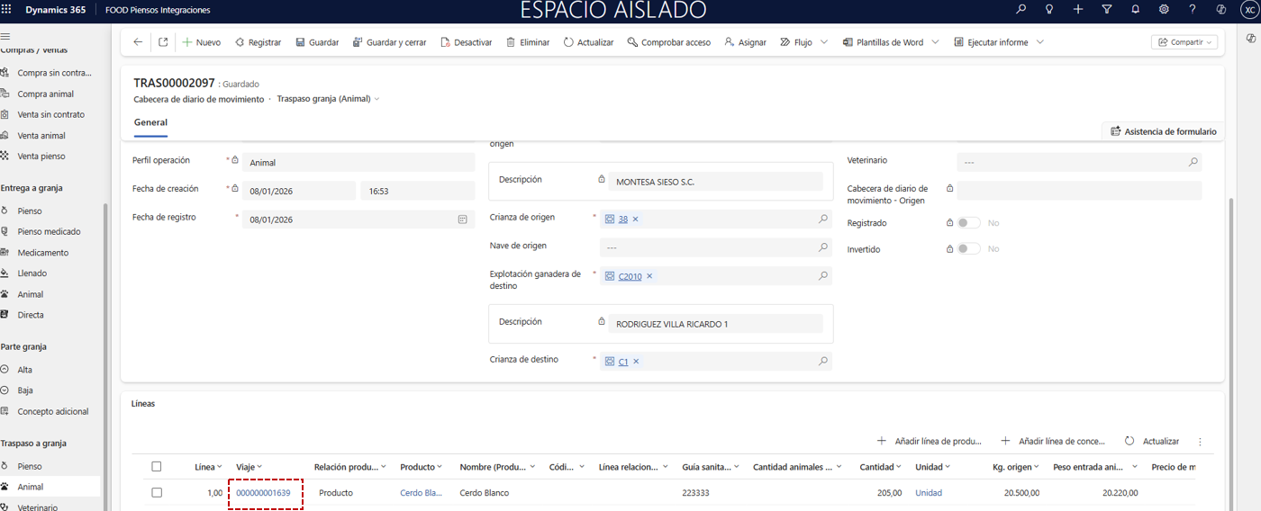 Estos dos campos deben heredarse siempre al generar el viaje desde el diario de Traspaso a granja: Animal.