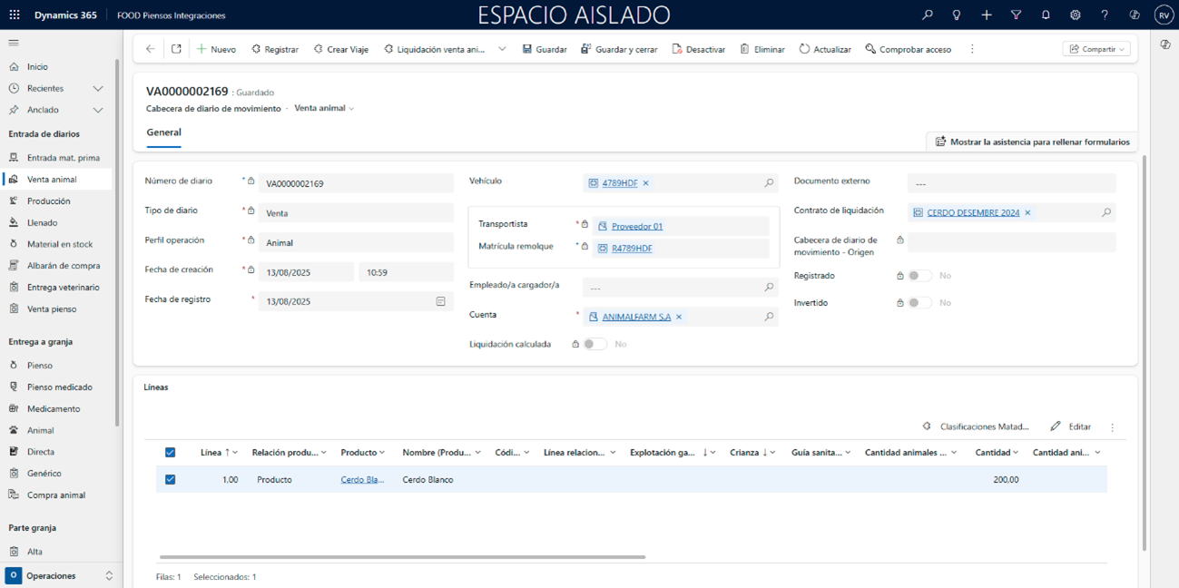 Si la línea tiene un Vehículo informado, el sistema puede generar automáticamente un viaje vinculado, visible desde la línea del diario de Venta animal.