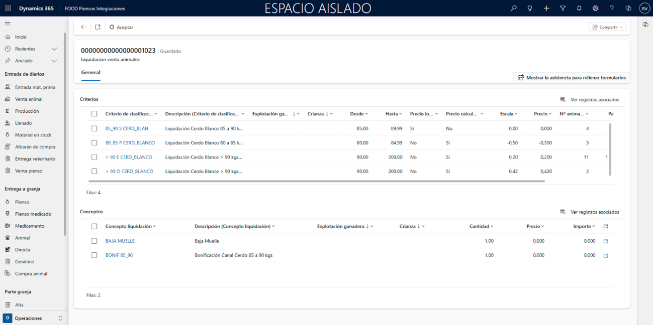 - Conceptos de liquidación: componentes económicos que se añaden o se restan al importe base (según peso, peso oreo o unidad), permitiendo reflejar ajustes, primas o servicios adicionales.