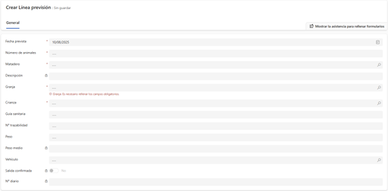 Número de animales: Animales previstos para ese día. No puede superar el disponible según Animal + Explotación ganadera + Crianza.