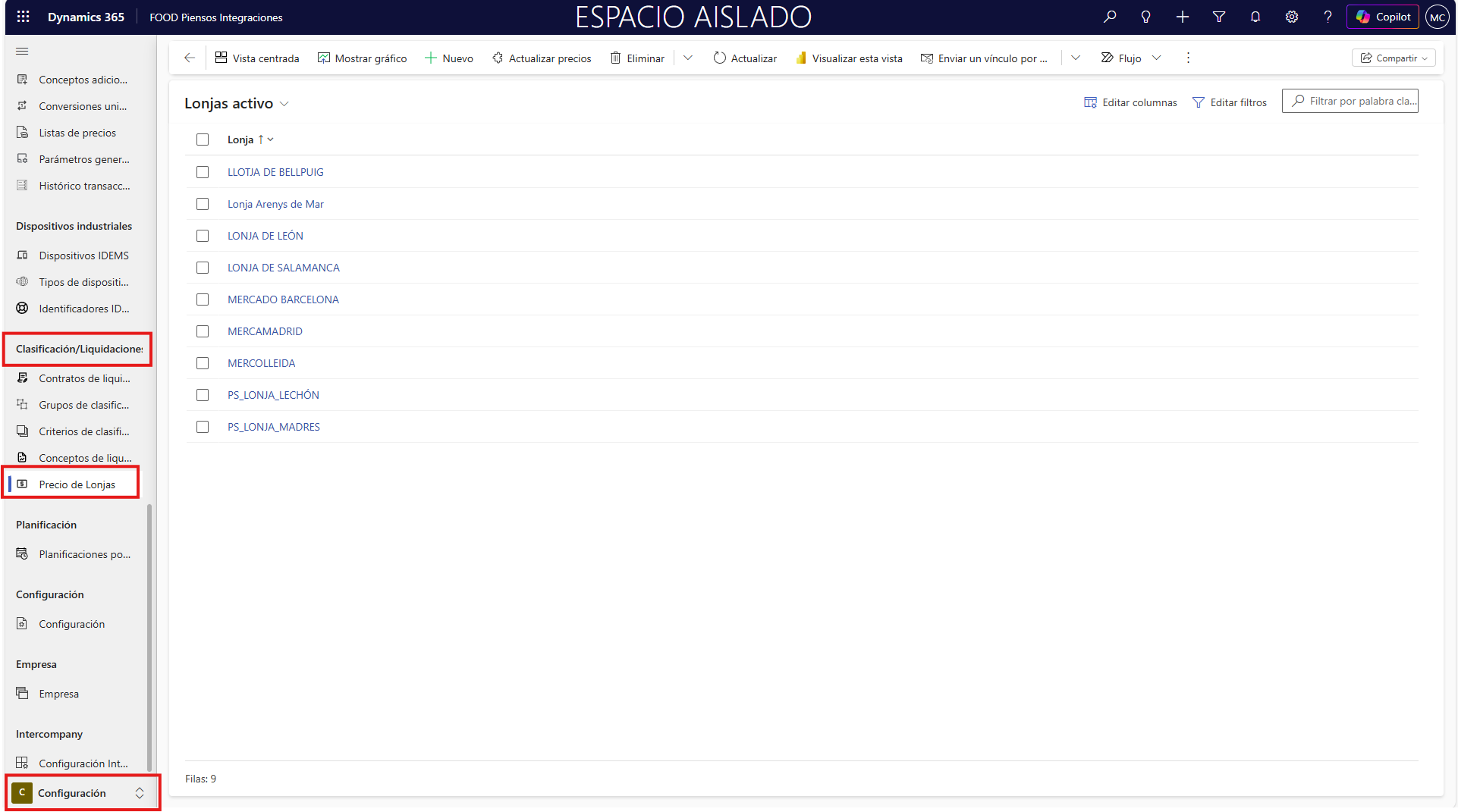 Para acceder al menú: Configuración > Clasificación/Liquidaciones > Precio de Lonjas