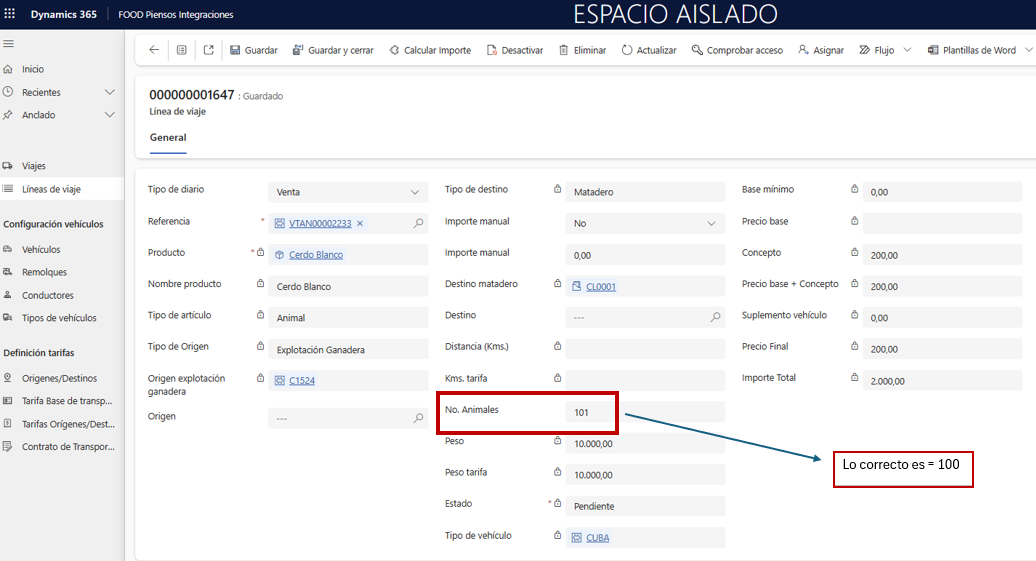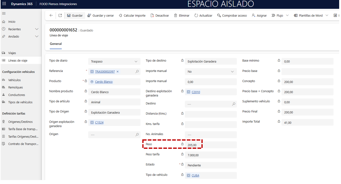 En la línea del viaje, el campo Peso aparece con un valor incorrecto: