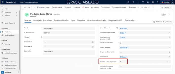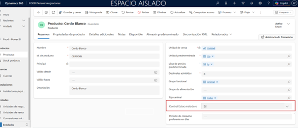 En caso que se siga la funcionalidad actual de controlar el estoc una vez salen los animales de la granja, el código de artículo de la línea deberá tener la siguiente configuración: