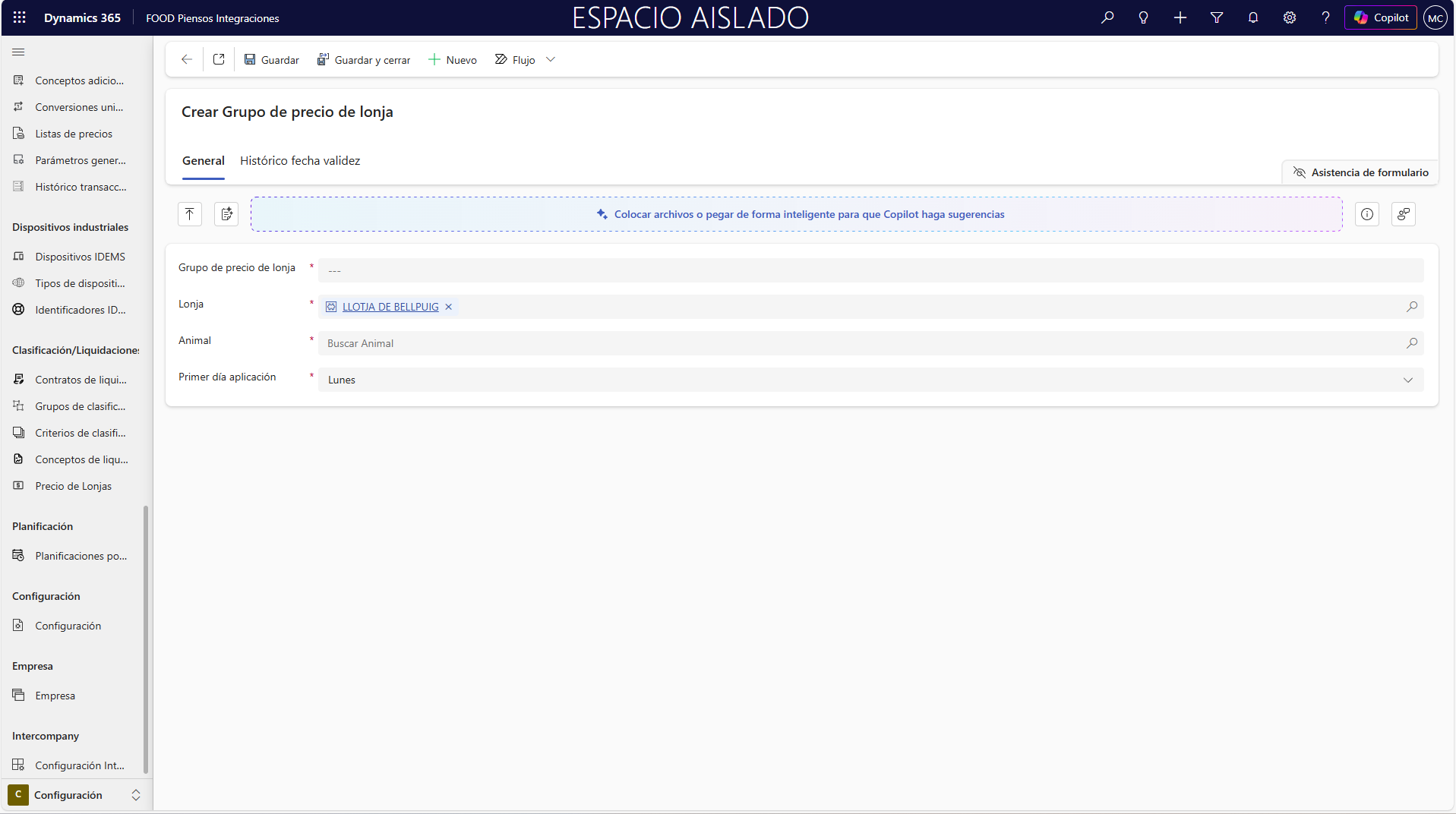 Una vez guardada, podrá crear los grupos de precio asociados. Pulse +Crear Grupo de precio de lonja.
