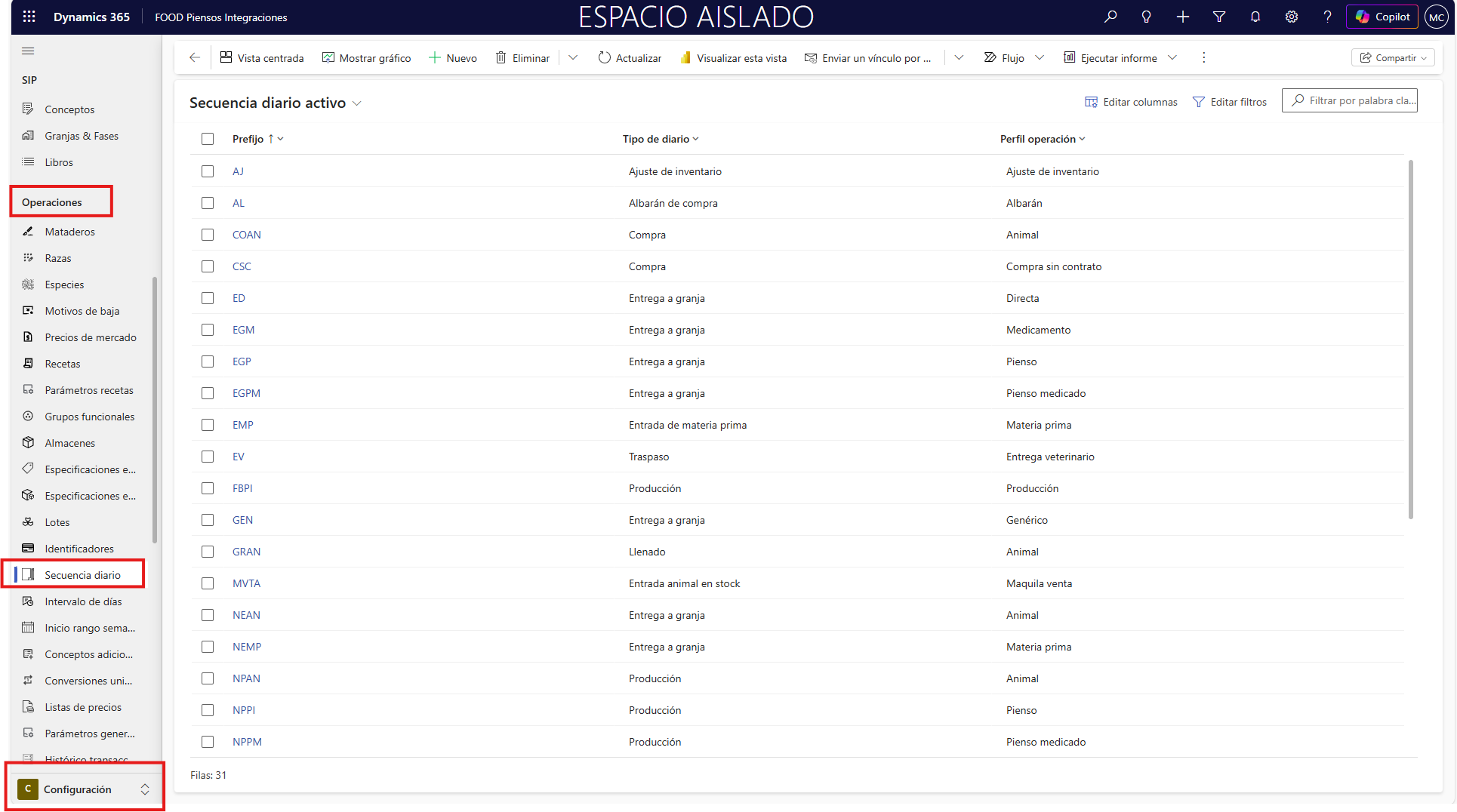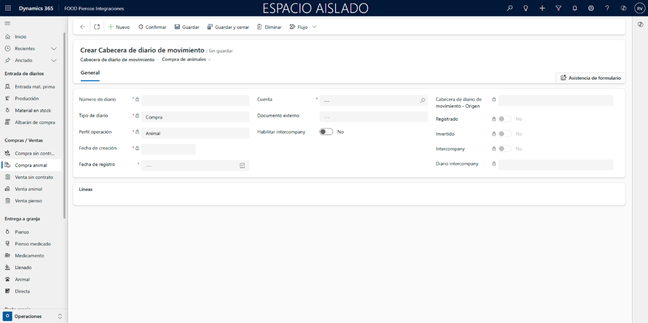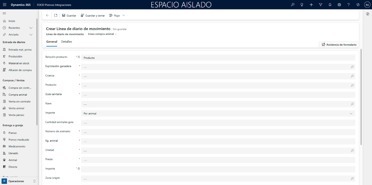 Cada operación dispone de su propio perfil de operación y una secuencia de diario específica, lo que garantiza un control adecuado de los movimientos, una correcta trazabilidad y una integración coherente con el resto del sistema. A lo largo de esta guía se aportan definiciones reforzadas y ejemplos reales de entorno granja/fábrica para que el usuario sepa exactamente qué debe consignar en cada campo.