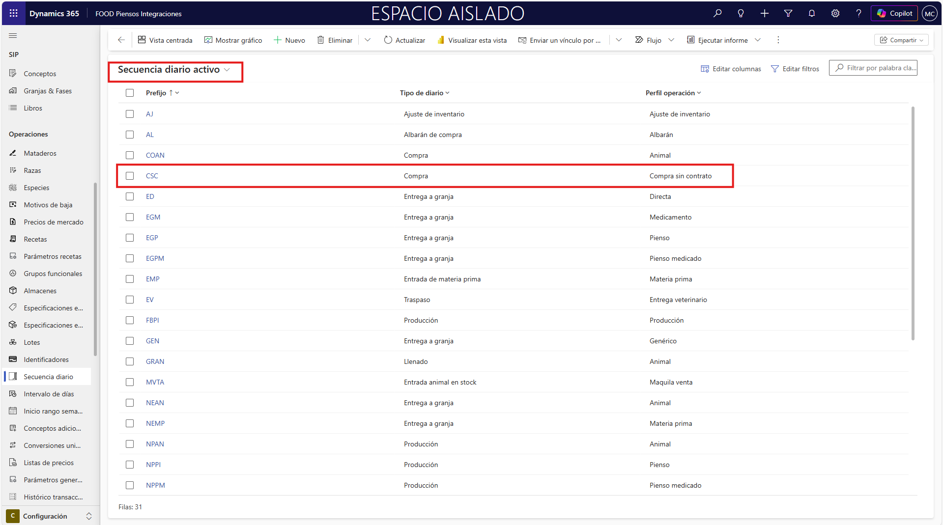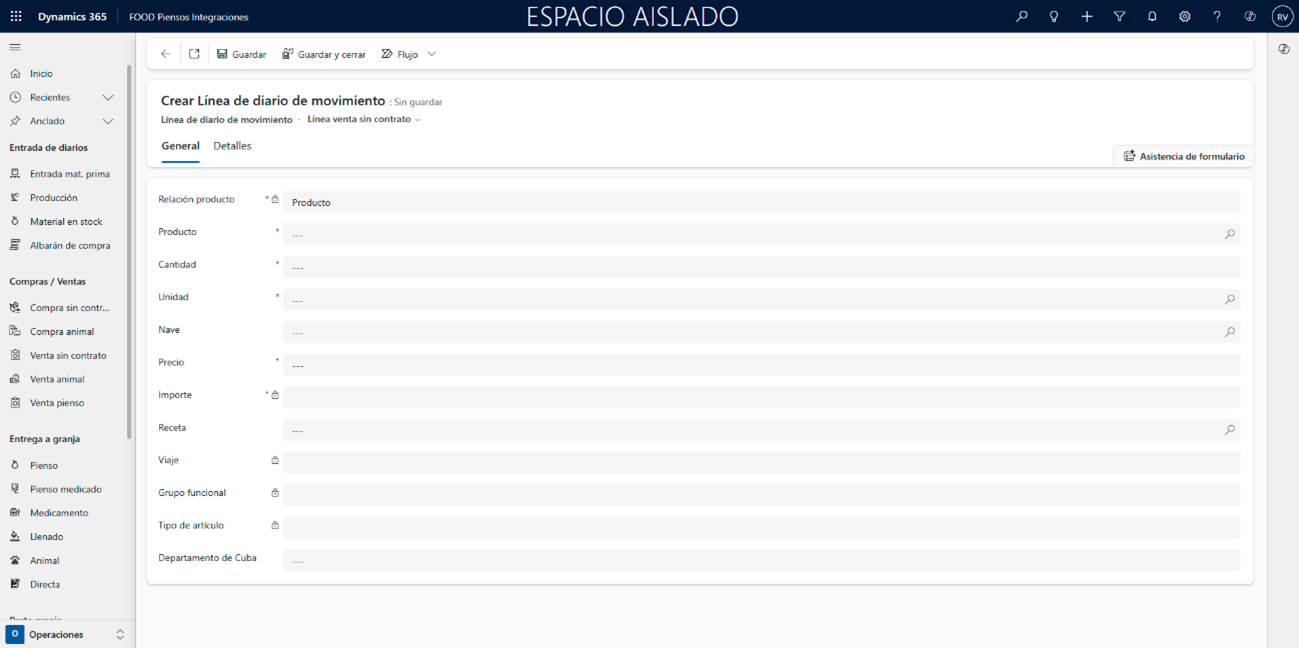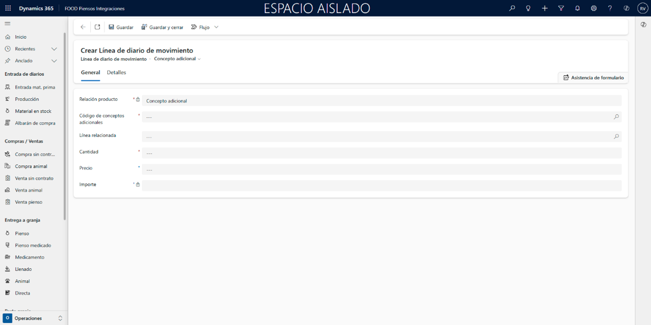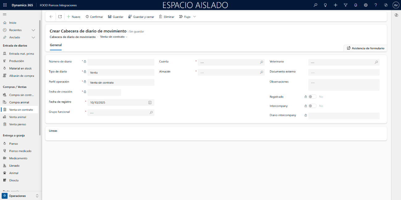 Cada operación dispone de su propio perfil de operación y una secuencia de diario específica, lo que garantiza un control adecuado de los movimientos, una correcta trazabilidad y una integración coherente con el resto del sistema. A lo largo de esta guía se aportan definiciones reforzadas y ejemplos reales de entorno granja/fábrica para que el usuario sepa exactamente qué debe consignar en cada campo.