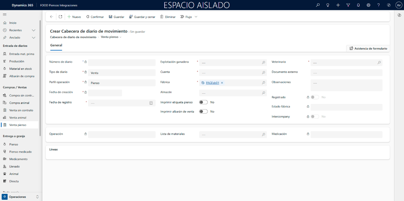 Las ventas de pienso registran la comercialización de alimento a explotaciones no integradas (cliente externo). El diario controla cantidades, trazabilidad, precios, transporte y relación comercial.