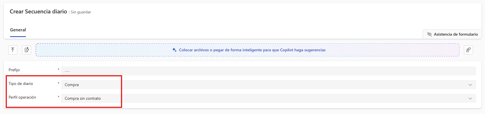 • Tipo de diario: Determina el circuito funcional y validaciones del documento. Seleccione Compra.