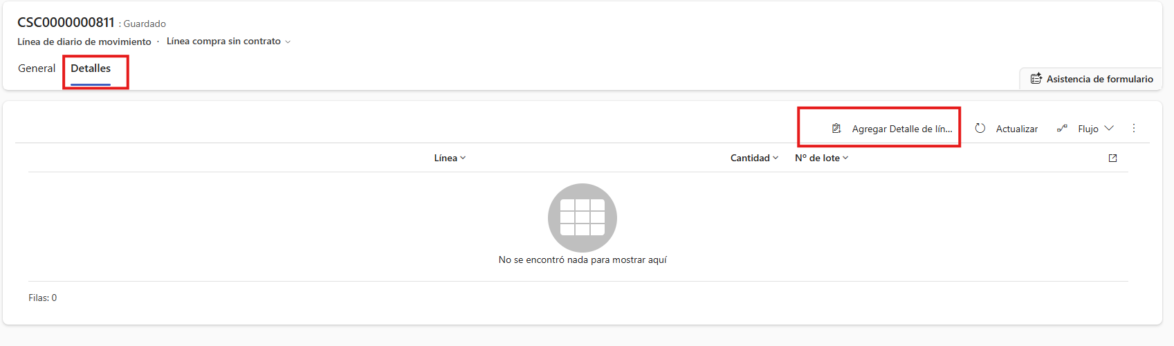 Si el grupo funcional del producto lo requiere, cree el detalle que en este caso sería el Nº de Lote desde Detalles con + Crear Detalle de línea de diario de movimiento: