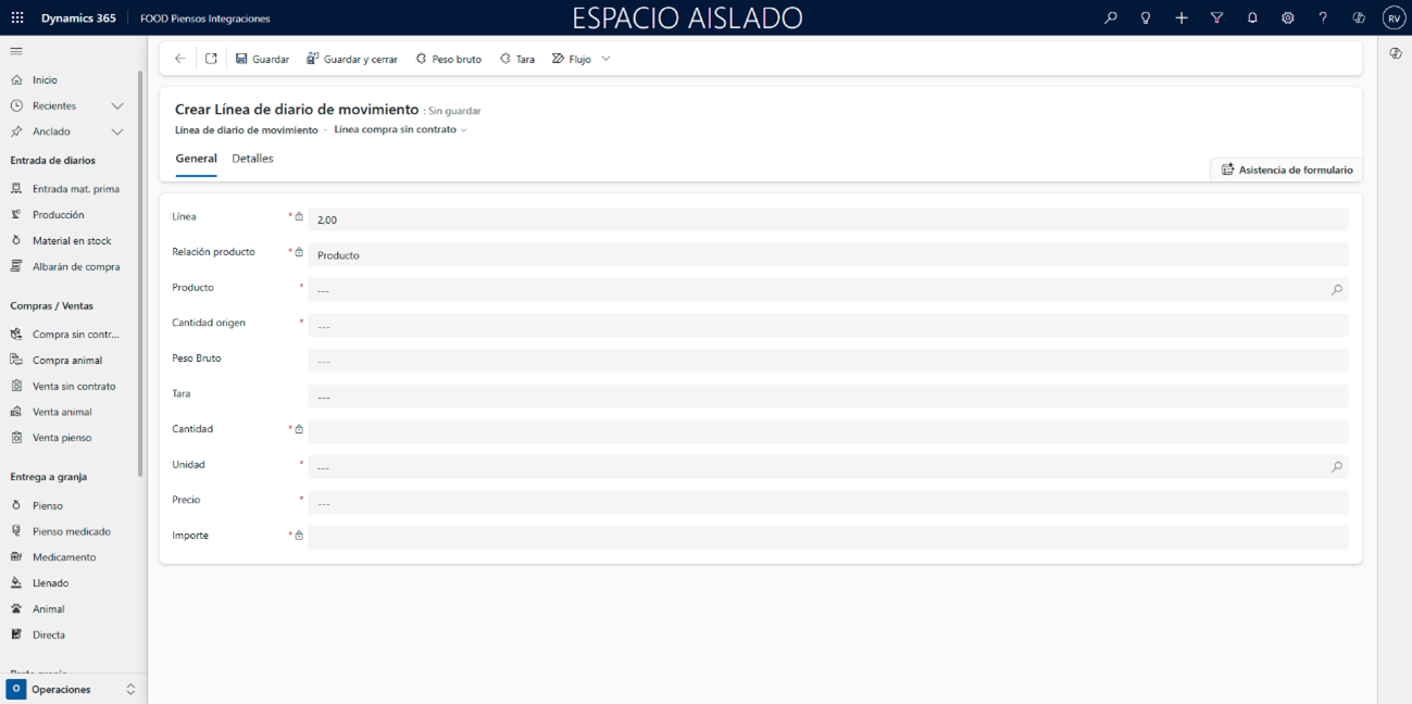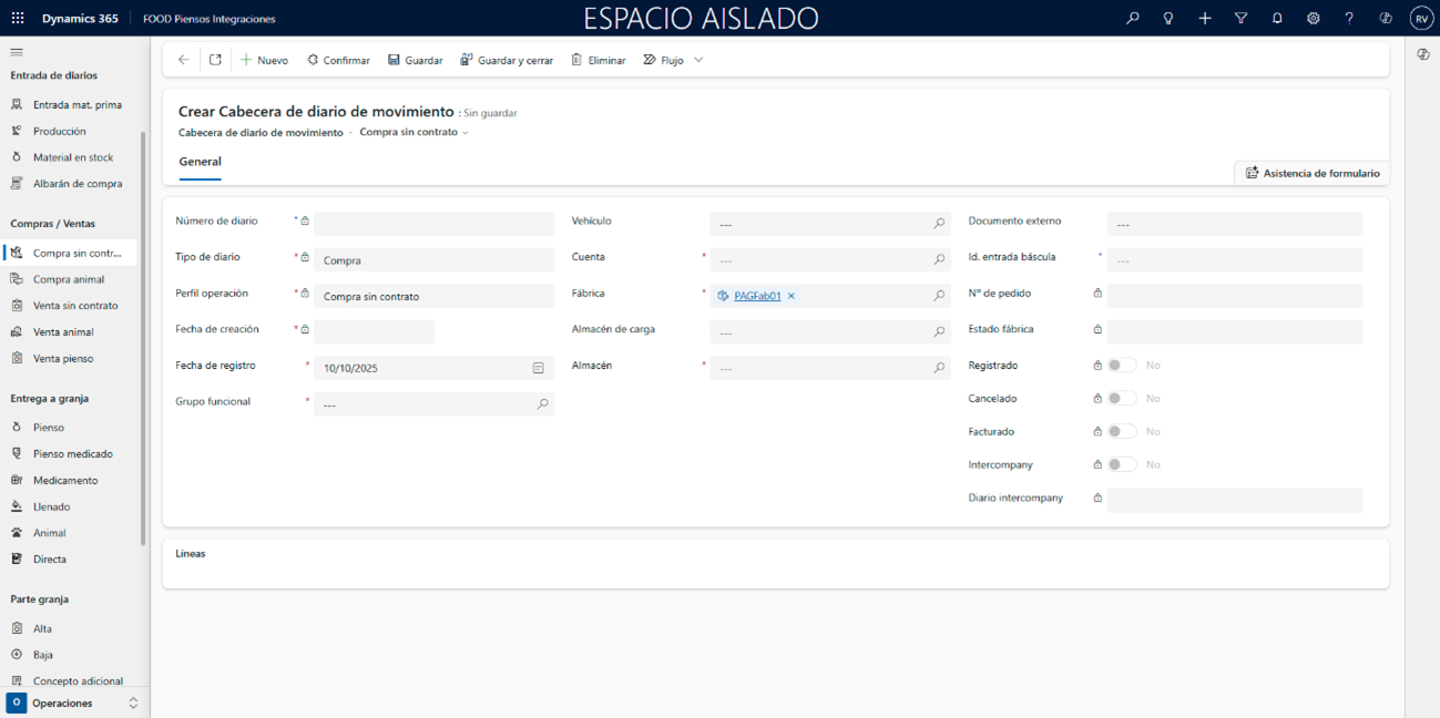 Las compras sin contrato son aquellas adquisiciones de materias primas, piensos u otros productos en las que no existe un contrato previo asociado. En este tipo de operaciones, el proveedor suministra el producto y la compra se registra directamente mediante un diario, sin vinculación a una aplicación contractual ni a condiciones prenegociadas dentro del sistema.