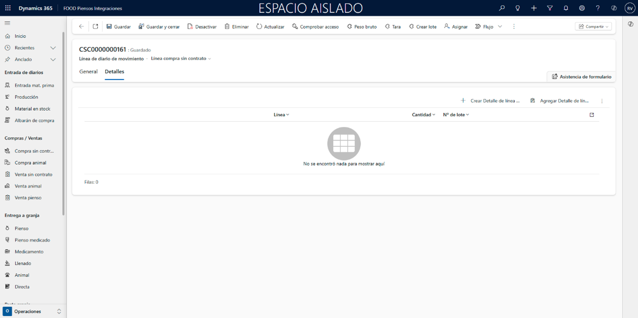 La cantidad del detalle debe coincidir con la de la línea ver DLotes FOOD Piensos Integraciones.