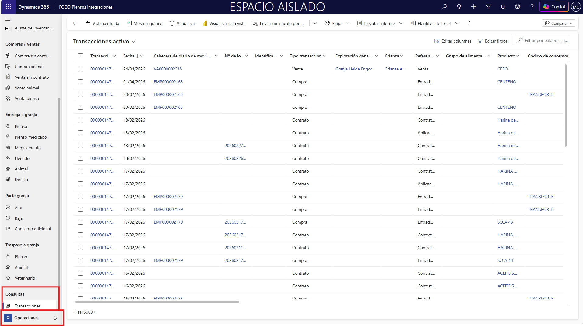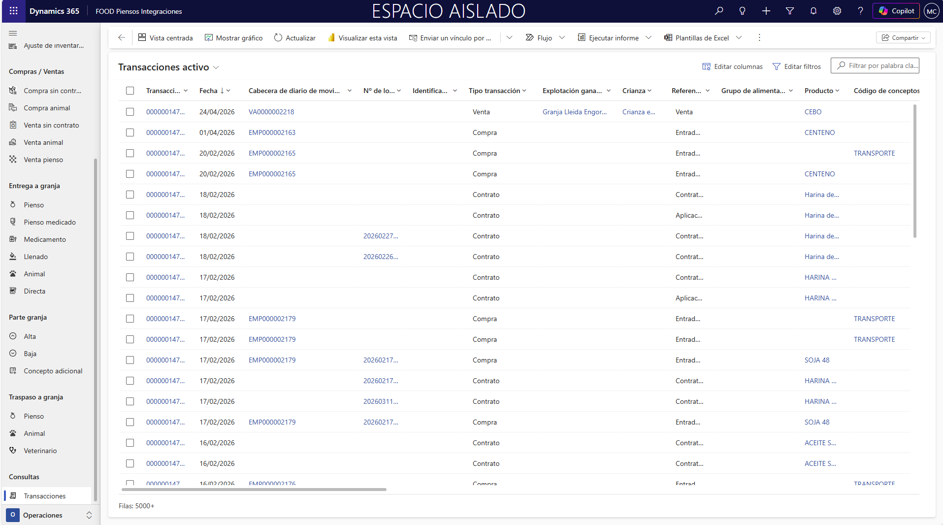 Estas transacciones actúan como el registro detallado y permanente de todas las operaciones realizadas: movimientos de stock, entradas y salidas de animales, consumos, traspasos, viajes, liquidaciones y cualquier otro evento que modifique datos dentro de la explotación o el almacén.