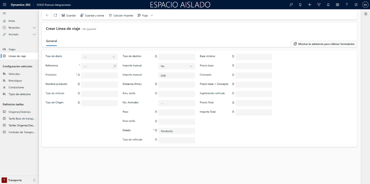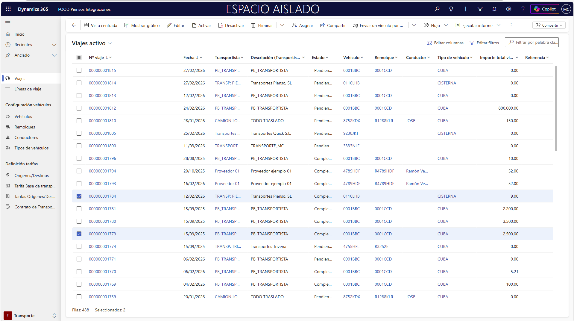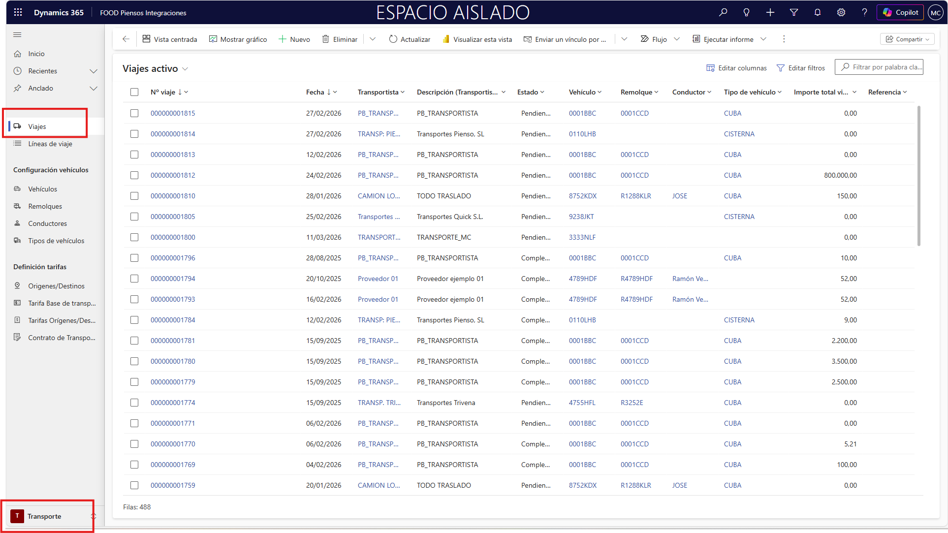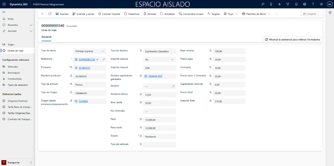 Los viajes pueden registrarse generando automáticamente una transacción, que documenta la operación realizada y permite un seguimiento completo de su coste. En las siguientes secciones se explicará el punto de menú desde el cual visualizar todos los viajes generados, así como los dos métodos disponibles para crearlos y calcularlos. De este modo, el usuario podrá gestionar de forma eficiente toda la operativa diaria de transporte dentro de FOOD Piensos Integraciones, asegurando coherencia entre los contratos, los precios y la ejecución real de los viajes.