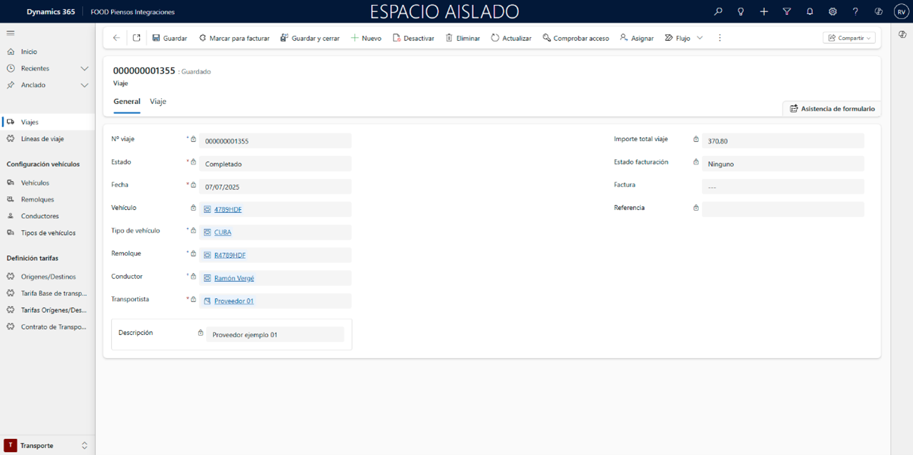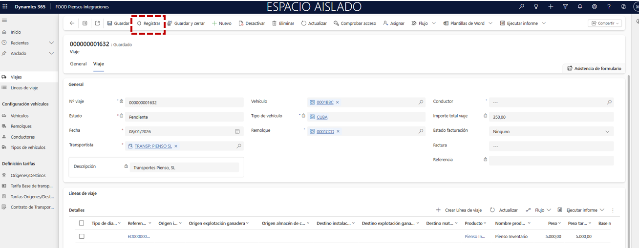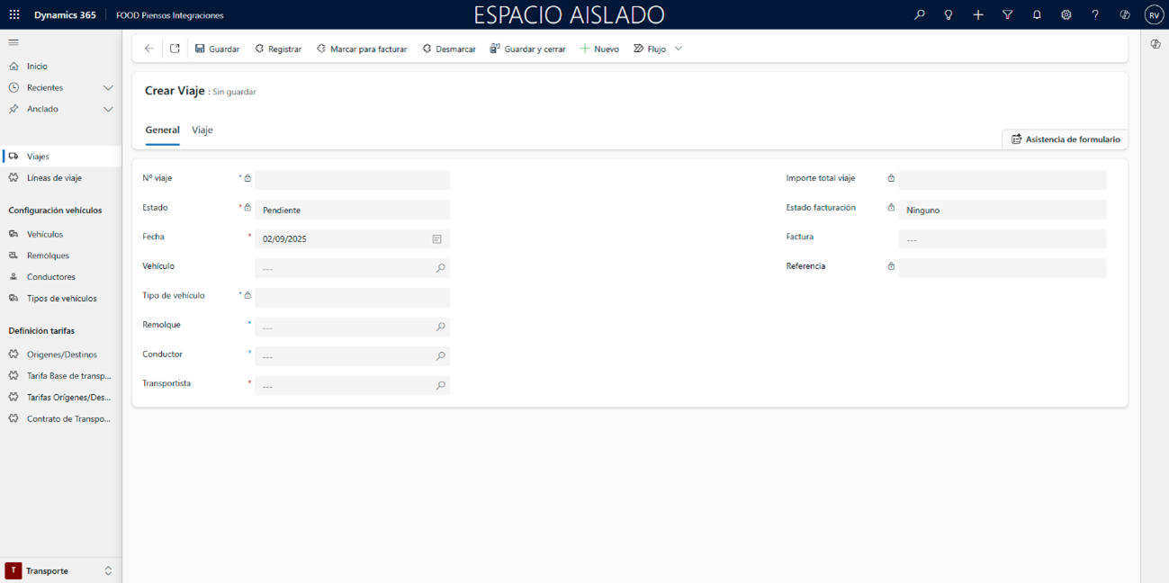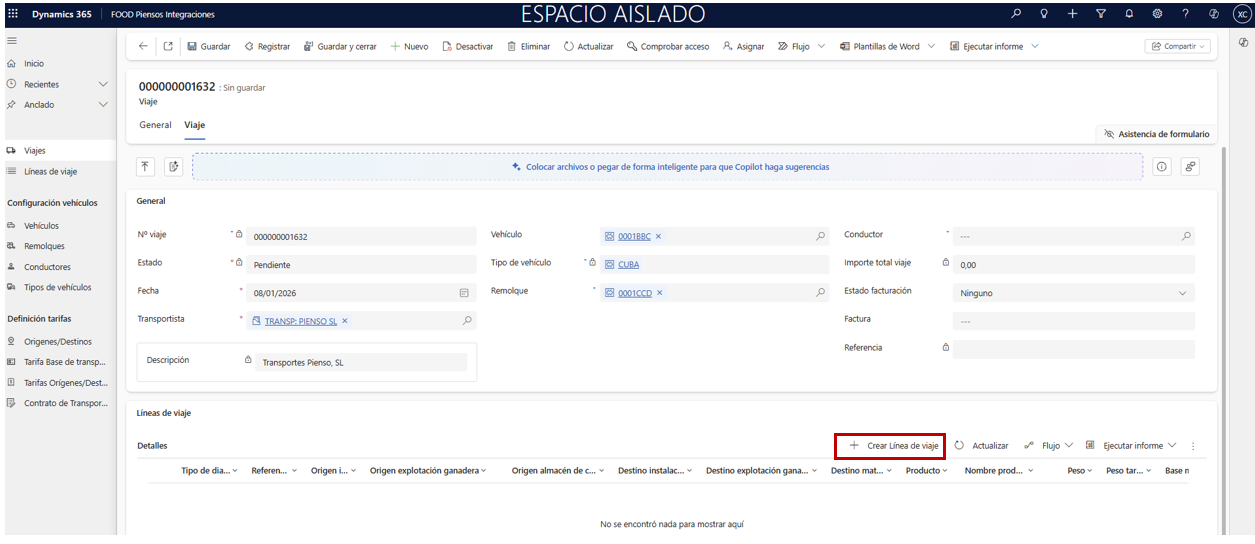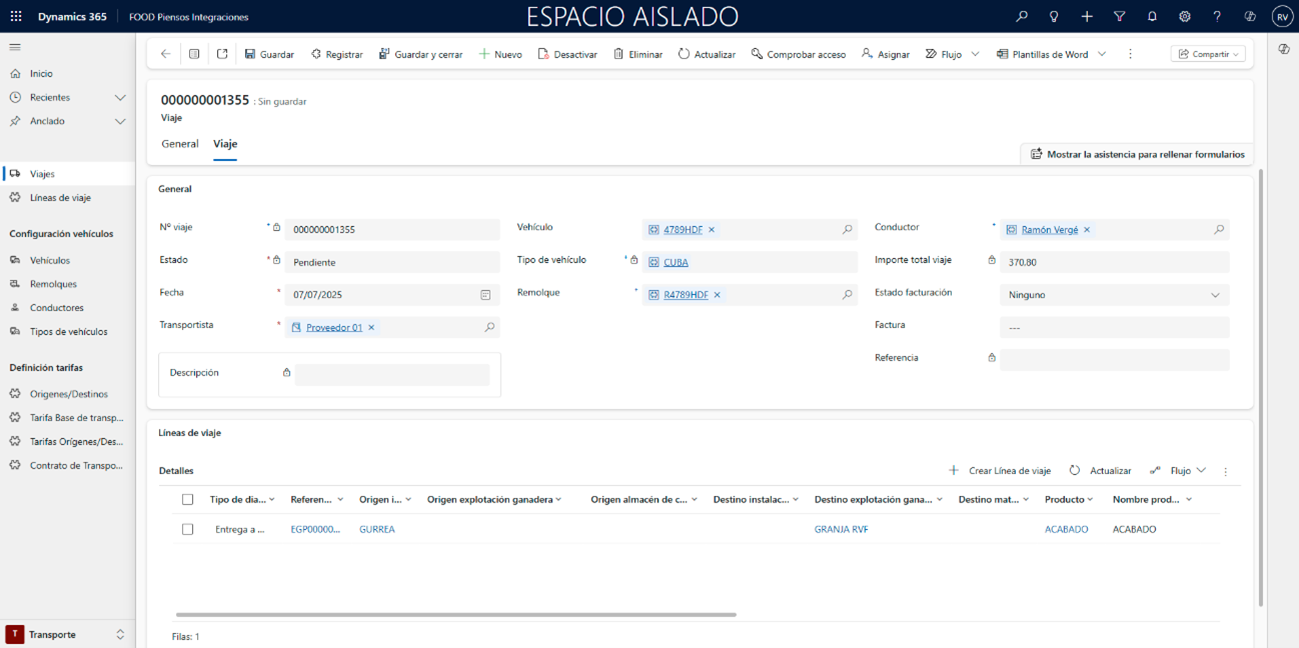 En la cabecera del viaje, indique los campos Vehículo, Remolque, Conductor y Transportista (si lo necesita, regrese a la ruta Transporte FOOD Piensos Integraciones), y pulse Guardar para habilitar la segunda pestaña.