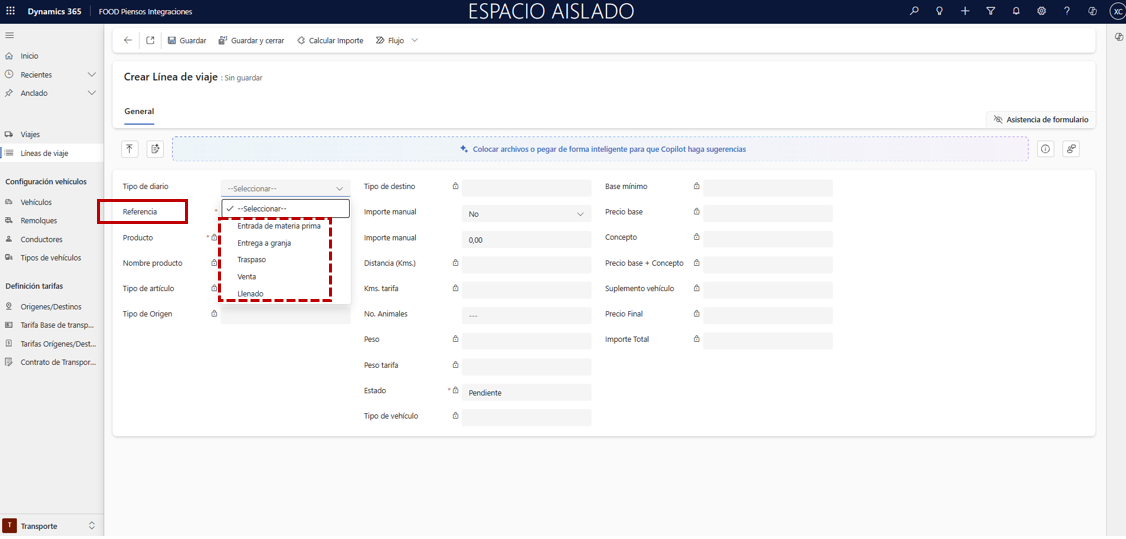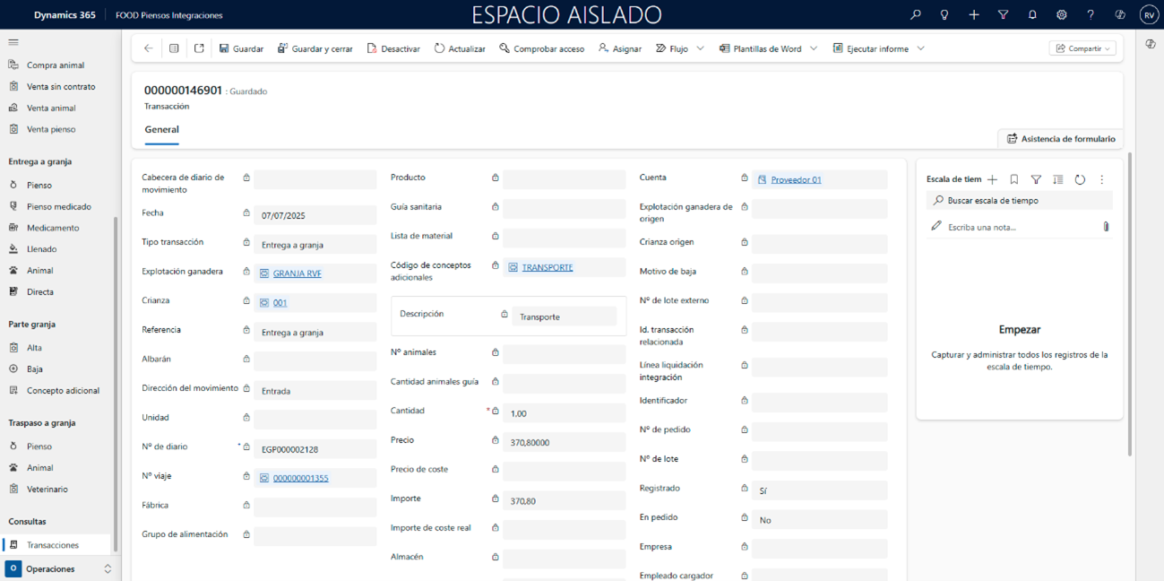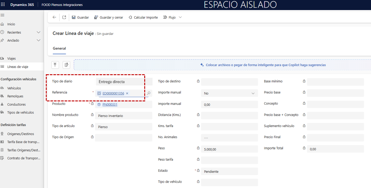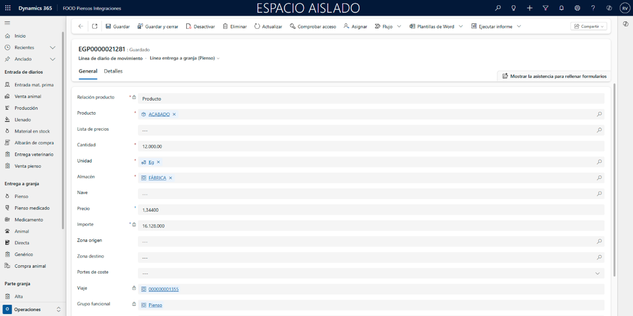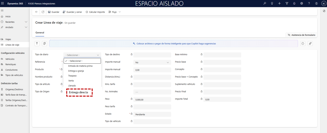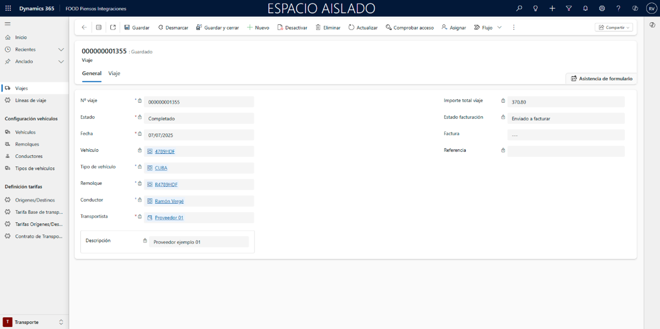 En la cabecera del viaje, indique los campos Vehículo, Remolque, Conductor y Transportista (si lo necesita, regrese a la ruta Transporte FOOD Piensos Integraciones), y pulse Guardar para habilitar la segunda pestaña.