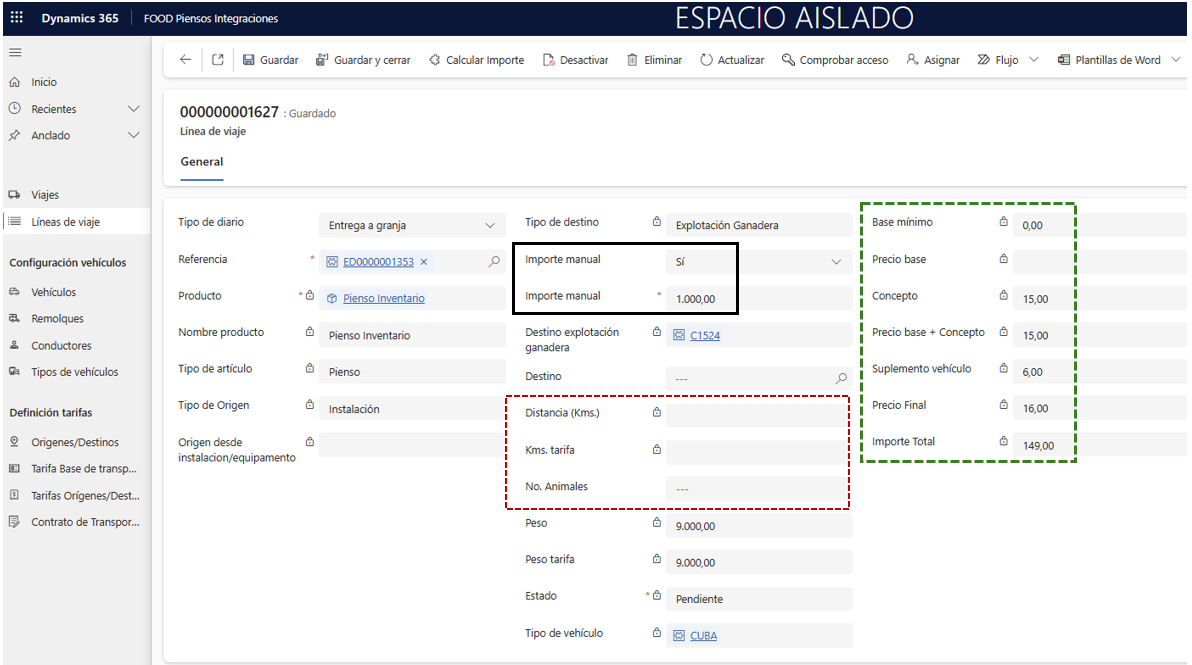 - Si se marca Importe manual = Sí, se debe poder registrar el viaje aunque no haya datos suficientes de transporte.