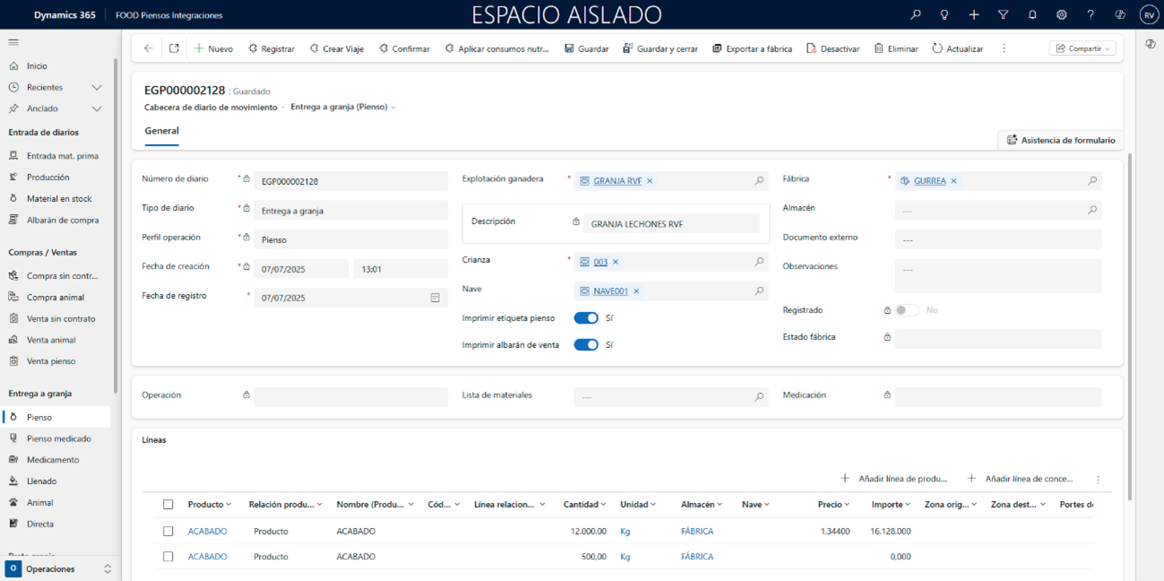 El proceso estará habilitado para las operaciones de Entrada mat. prima, Venta animal, Llenado, Entrega pienso, Entrega pienso medicado, Traspaso pienso y Traspaso animal.